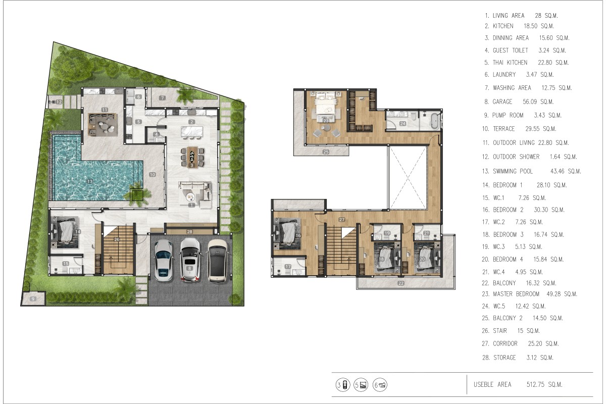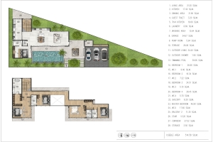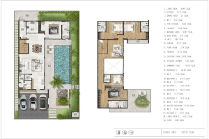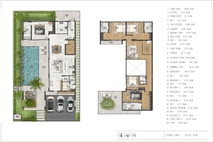 There are 4 villa layouts available. Each offers a generous built-up area of 513–596 sqm and parking for 3 cars. All villas feature a ground-floor ensuite bedroom with direct pool access and an open-plan living, dining, and kitchen area that flows onto the pool terrace. The upper level has 4 more ensuite bedrooms. Select layouts also provide family spaces or private outdoor areas.
