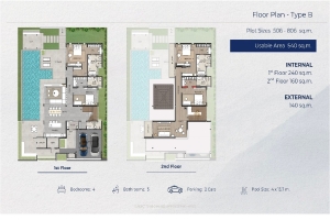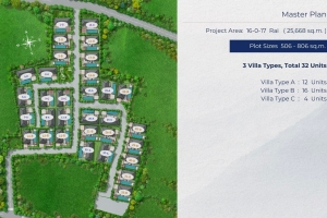 Set on land plots ranging from approximately 530 to 750 sqm, each villa allows ample space for landscaped gardens and outdoor living. The layout includes large swimming pools measuring around 4 × 13 metres, along with covered parking for 2 cars.