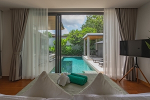 With a built-up area of 340 sqm, the villa features an open-plan living, dining and kitchen area with floor-to-ceiling sliding glass doors opening directly to the pool terrace. Two bedrooms have both indoor access and direct access to the pool area. Meanwhile the 3rd bedroom is positioned towards the rear of the villa.