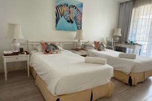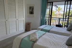 This 2-bedroom condo for sale in Laguna, Phuket comes fully furnished and includes a golf membership. The interior has a coastal, breezy resort feel, with white walls, an all-white kitchen, all-white bedroom furniture and black wicker pieces in the living and dining areas. These are complemented by tropical-patterned cushions, decor and artwork.