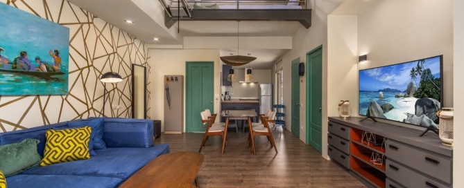 RESALE. Stylish 1-bedroom lakeside condo with additional loft area set up as a 2nd bedroom near Surin Beach, Phuket. Chic interiors and large balconies overlooking the lake and pool.