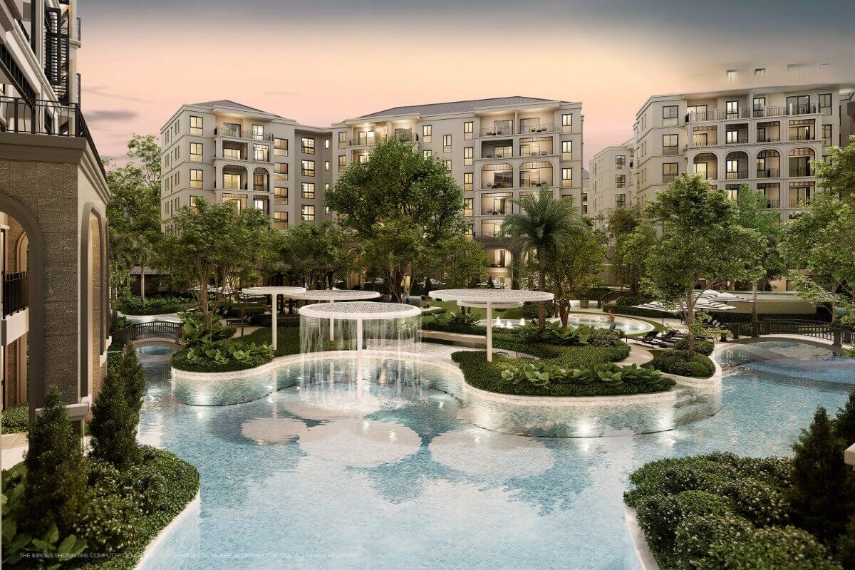 Resort-style highlights include multiple pools – lazy, lap, cave, hydrotherapy, and kids’ lagoon – plus water slides, a pool bar, and landscaped gardens with fountains and cascades. Outdoor zones such as the beach terrace, BBQ areas, and a multi-function pavilion encourage a vibrant, family-friendly lifestyle.
