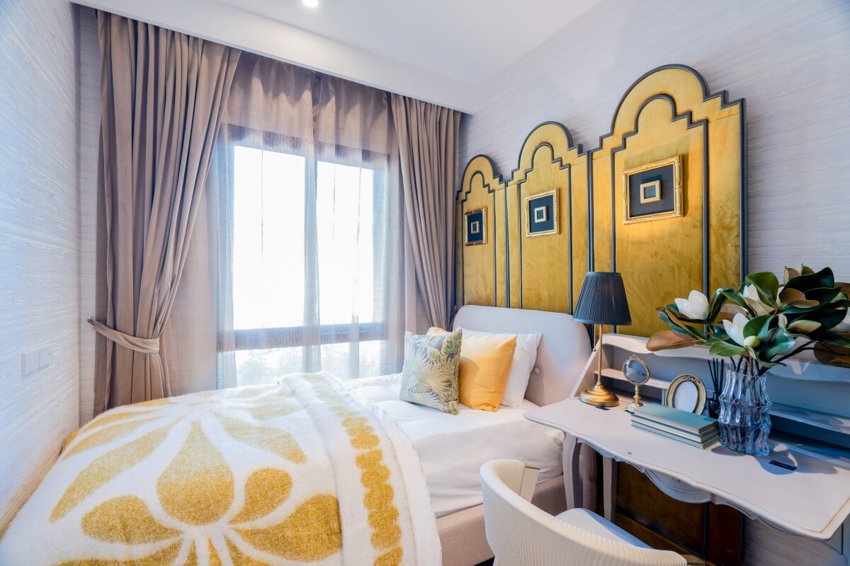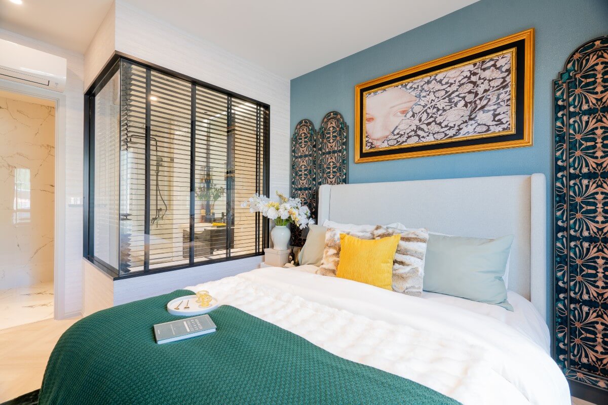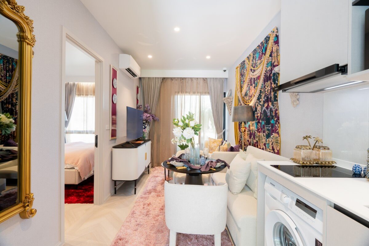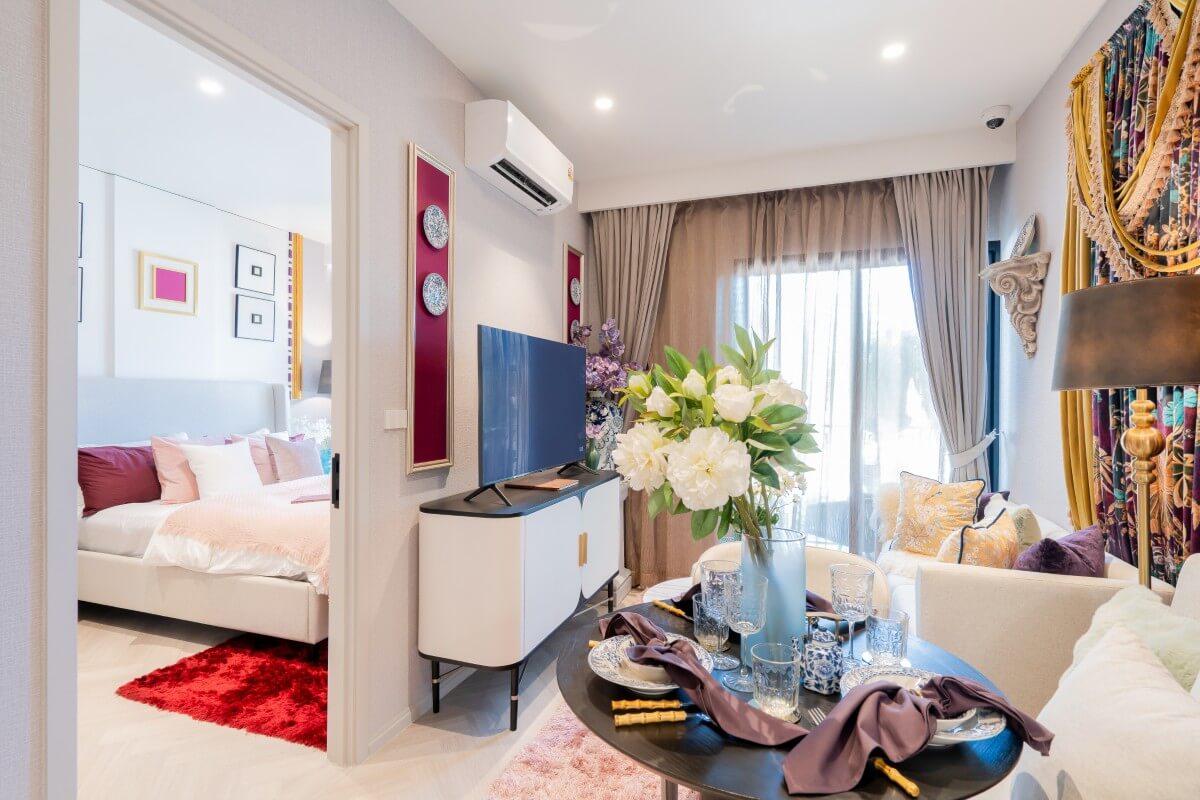 These 1-bedroom & plus condos for sale across the road from Boat Avenue and Porto de Phuket in the Bang Tao area are more than just a home – they are a statement of style. Interiors are stylish, with bold jewel colors, curated artwork, chandeliers, textured finishes, and patterned details that add charm & personality.