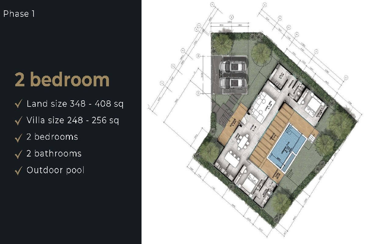 The 2-bedroom villas have 2 bathrooms and a built-up area of 248–256 sqm. Both bedrooms offer direct access to the pool deck, along with convenient indoor access. This layout is ideal for couples or retirees.