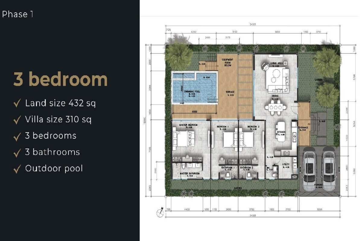 The 3-bedroom villas have 4 bathrooms and a built-up area of 310 sqm. All bedrooms offer direct access to the pool deck. This layout is ideal for vacation living or rental potential.