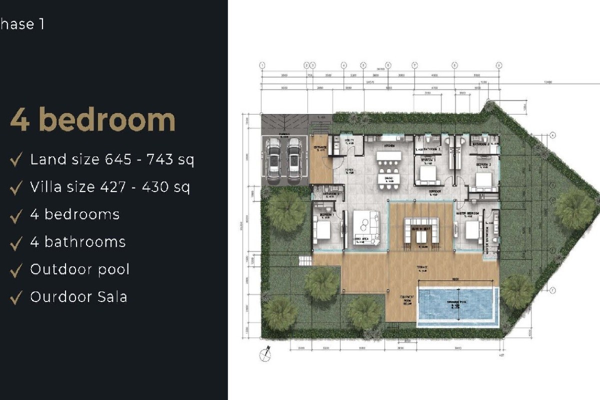 The 4-bedroom villas have 4 bathrooms and a built-up area of 427–430 sqm. Two bedrooms offer direct access to the pool deck as well as indoor access, while the remaining bedrooms are positioned toward the rear. This layout is ideal for families.