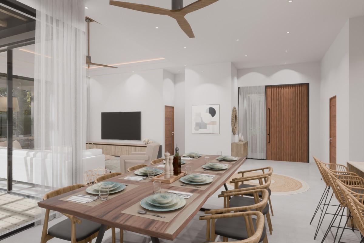 The development offers 3 single-storey villa types under one roof, each with open-plan living, dining, and kitchen areas that connect naturally to the pool terrace.