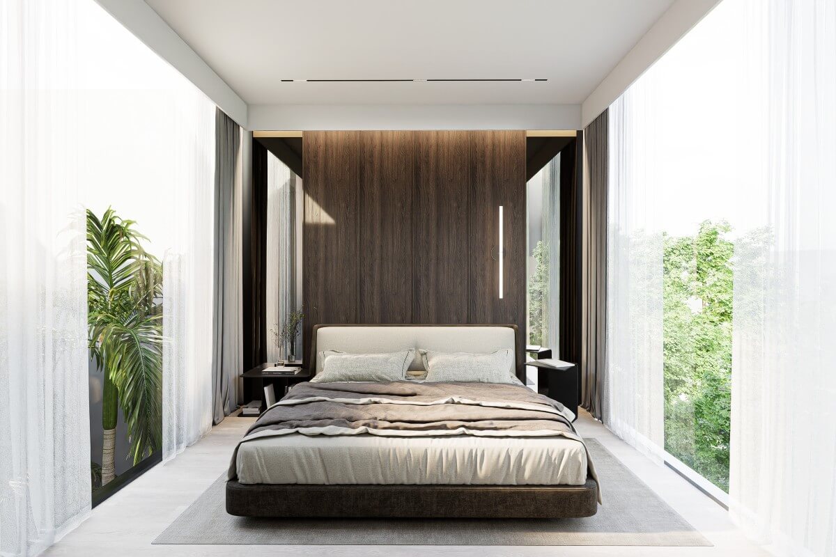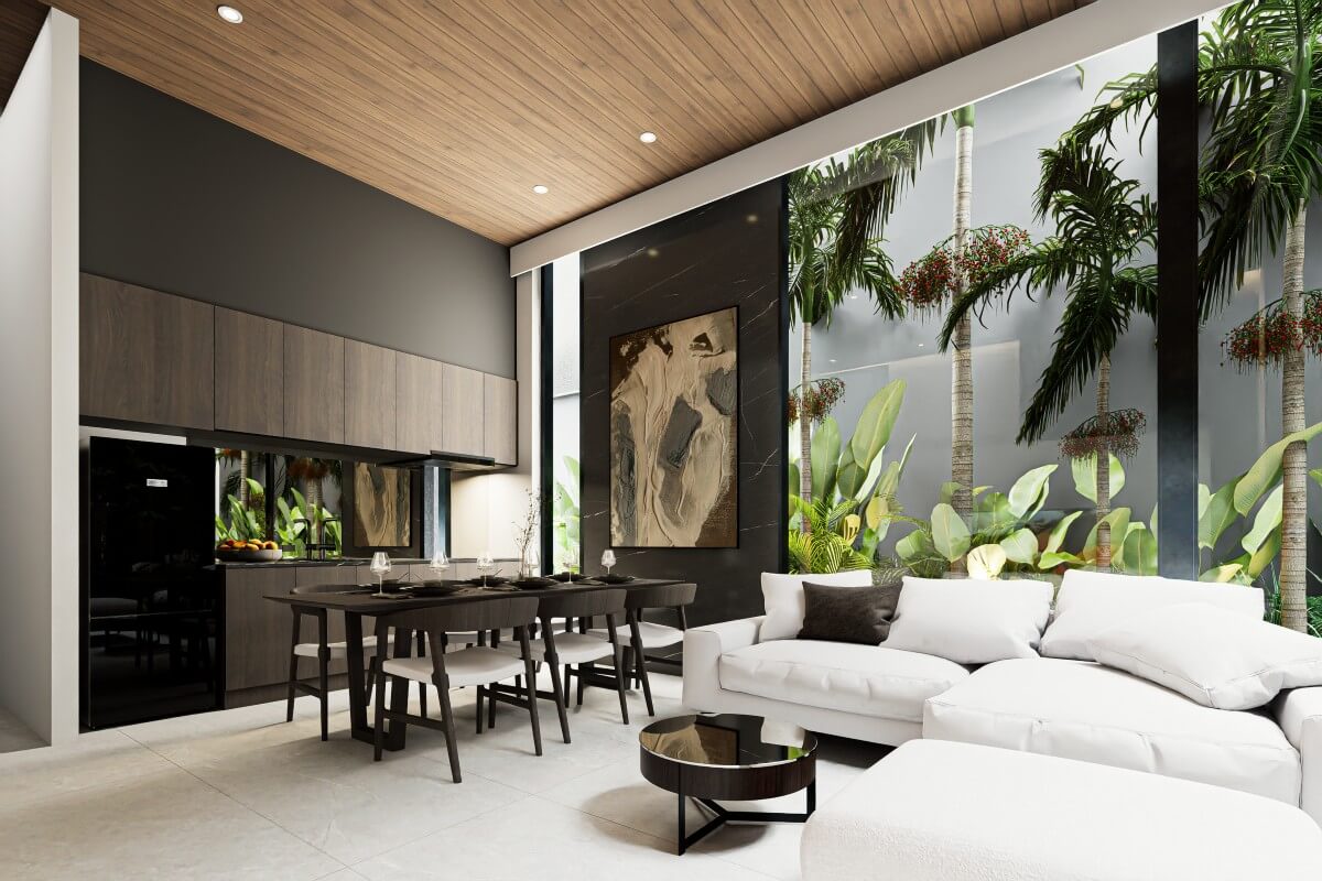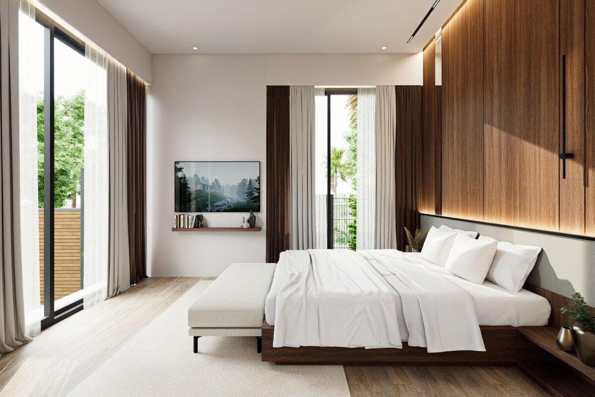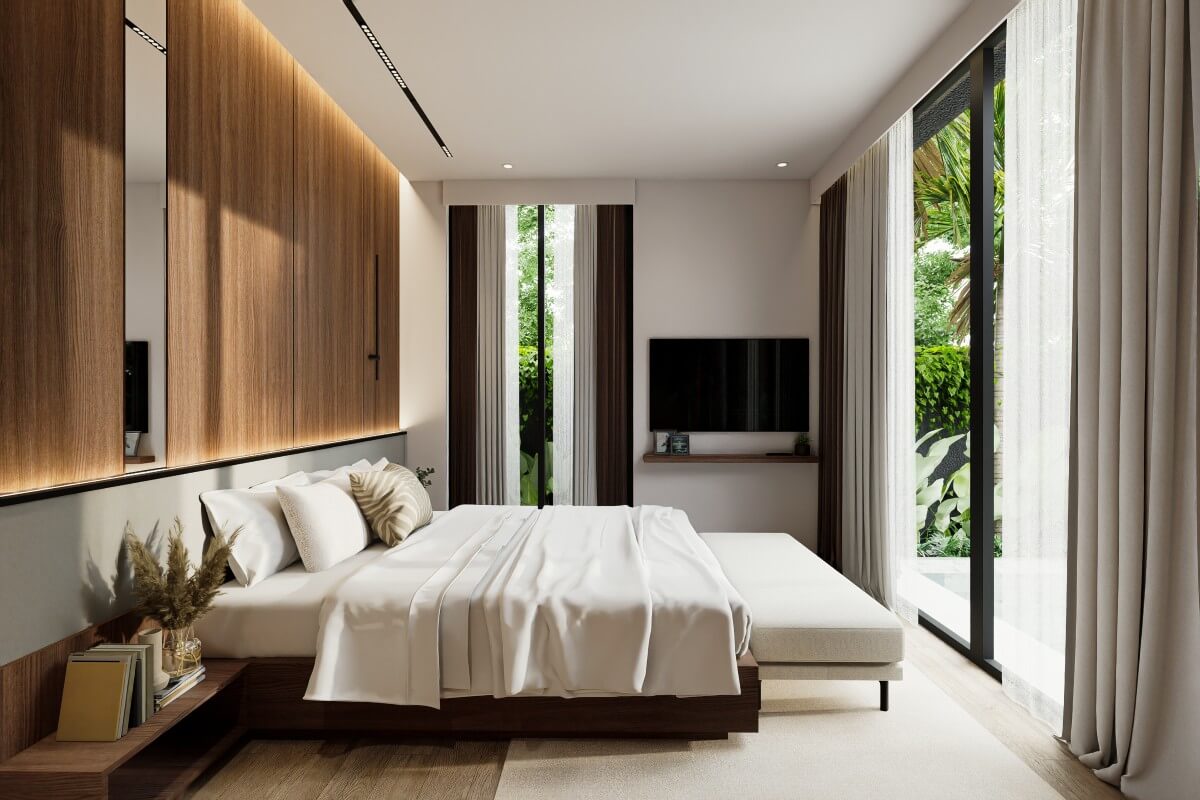 These 2–4 bedroom pool villas and townhouses for sale in Thalang, Phuket are near Blue Tree and feature a modern tropical, cube-style architectural design. Floor-to-ceiling doors and windows allow natural light to flow throughout, while wooden bedroom flooring and warm wood accents add balance and texture. Both the size and pricing position these homes for everyday use, making them suitable for full-time living or investment.