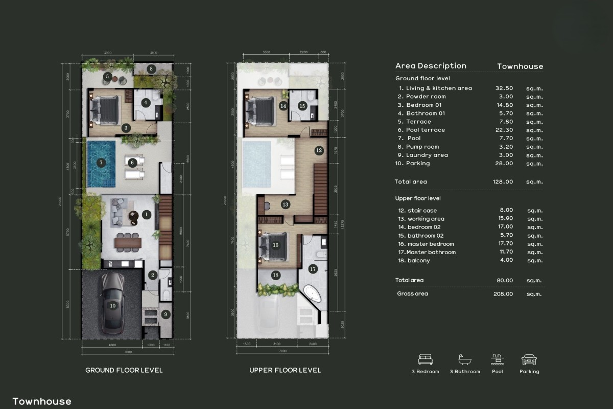 Townhouses are arranged across 2 levels and offer 2–3 bedrooms with built-up areas of 150–208 sqm. The ground floor includes an open-plan living area, 1 ensuite bedroom, and a guest bathroom. Both the living area and bedroom connect directly to the private pool. Upstairs, 2 additional ensuite bedrooms provide separation and privacy.