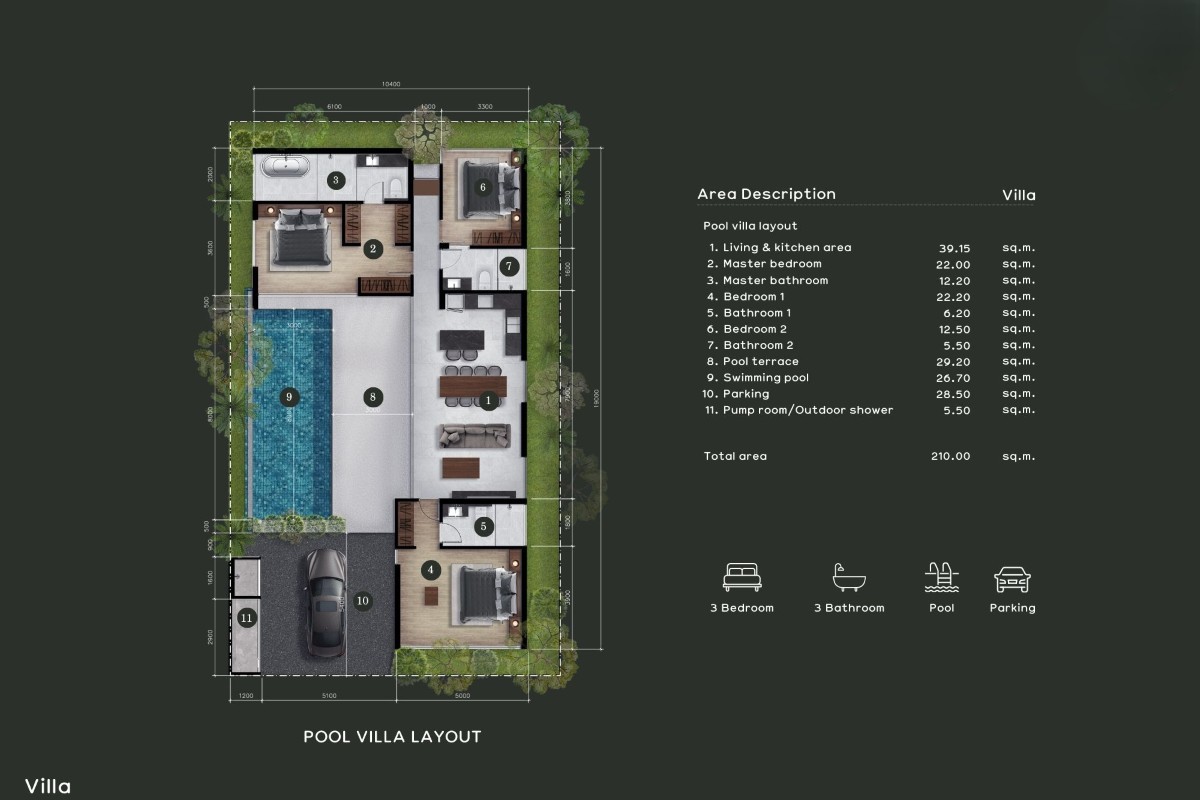 Villas are single-storey homes with 3–4 bedrooms and built-up areas of approximately 210–240 sqm. Each villa follows a U-shaped layout centred around the private pool. The master bedroom opens onto the pool terrace, while 2 additional bedrooms sit on either side of the open-plan living, dining, and kitchen area.