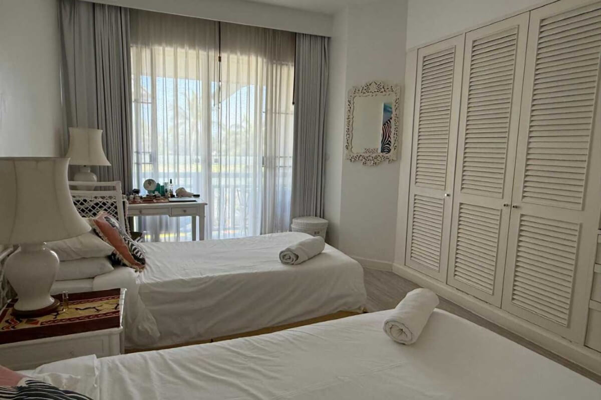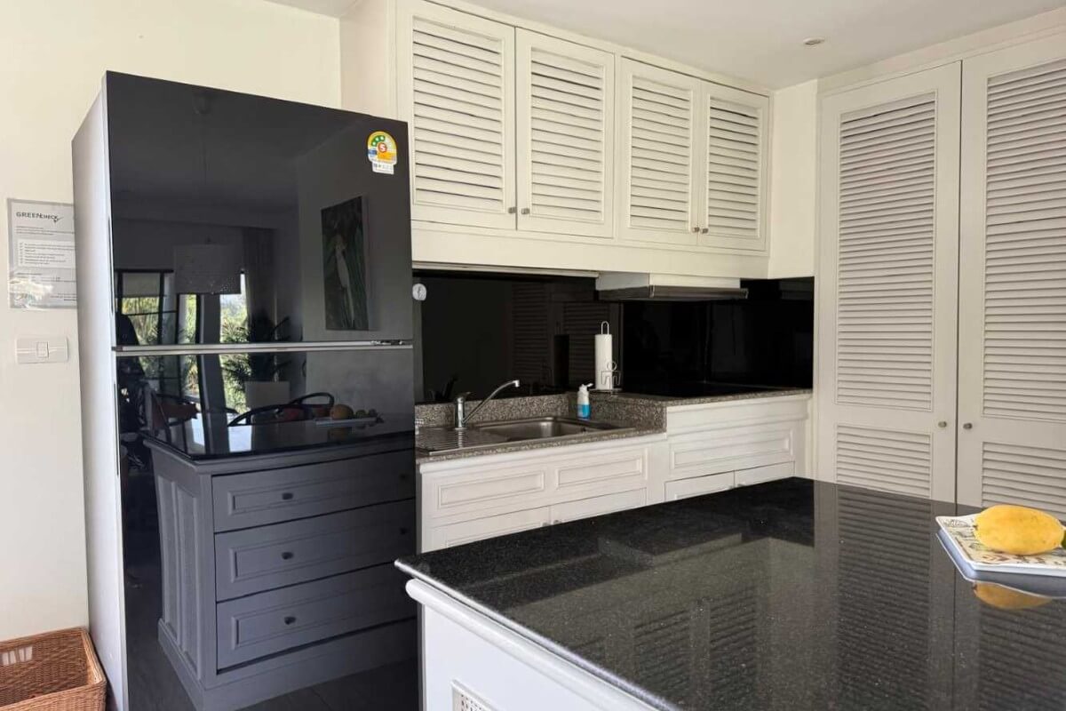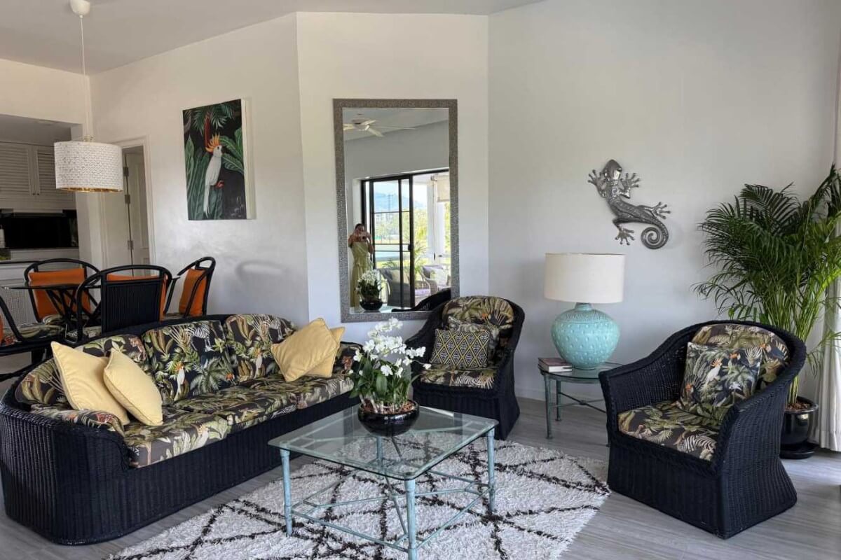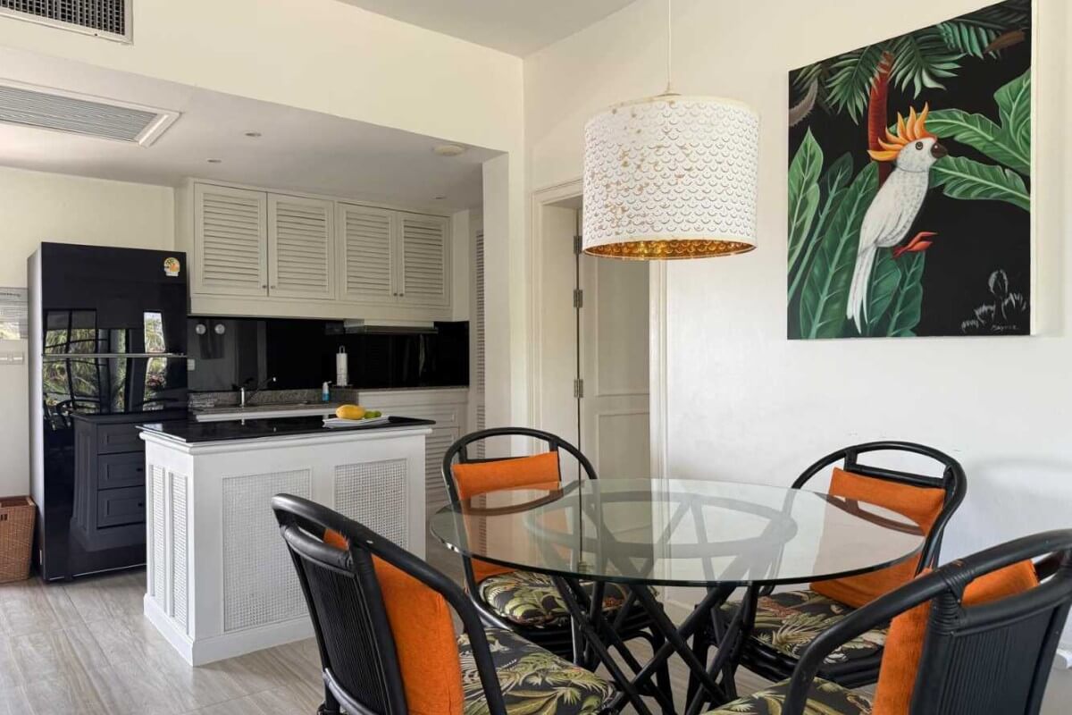 This 2-bedroom condo for sale in Laguna, Phuket comes fully furnished and includes a golf membership. The interior has a coastal, breezy resort feel, with white walls, an all-white kitchen, all-white bedroom furniture and black wicker pieces in the living and dining areas. These are complemented by tropical-patterned cushions, decor and artwork.