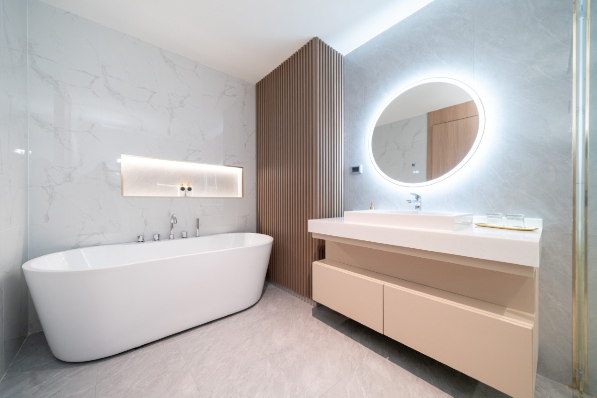 Interiors feature a refined palette of neutrals accented by warm earth tones and hints of gold. Clean lines, polished metal, and marble details add a contemporary edge while creating a calm, inviting atmosphere.
