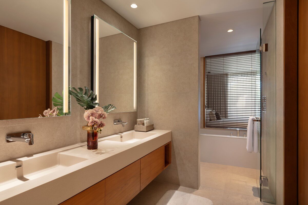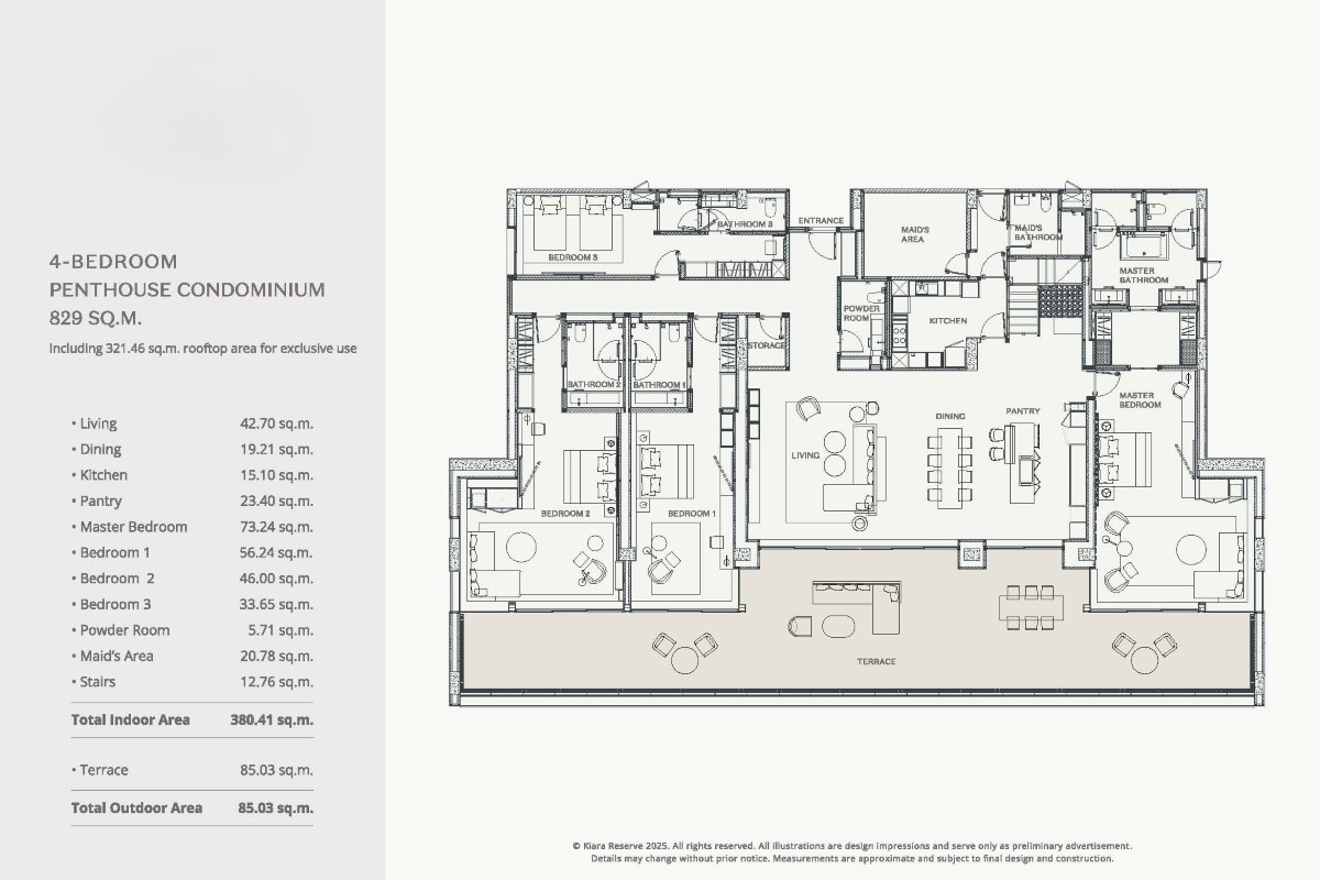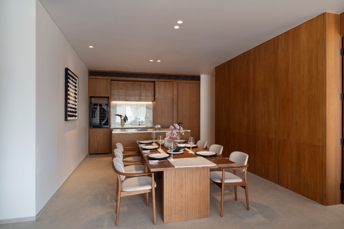 Penthouses are expansive 4-bedroom homes of up to 829 sqm over two levels. The lower floor includes open-plan living and dining areas, a separate kitchen, 4 ensuite bedrooms, and a maid’s room with ensuite.