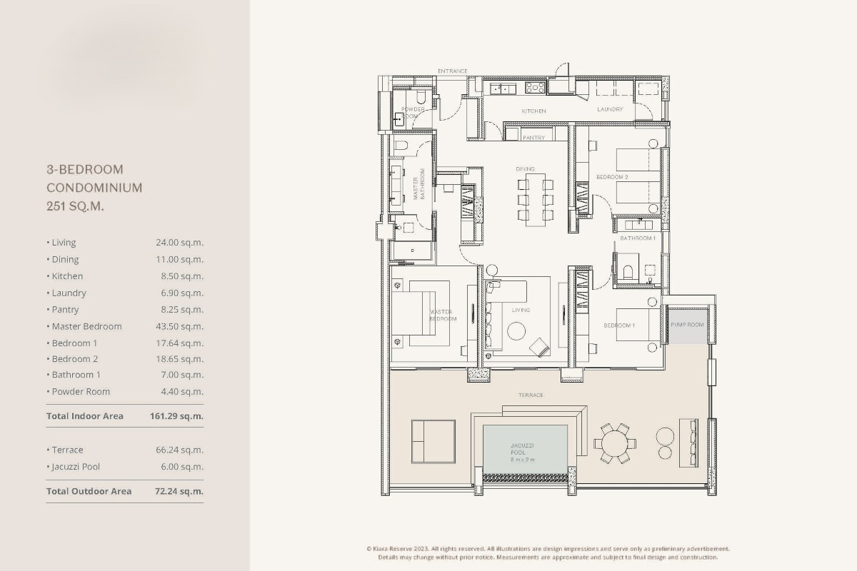 Single-storey residences offer 72.24 sqm of outdoor space, including a 66.24 sqm terrace and a 6 sqm jacuzzi pool.