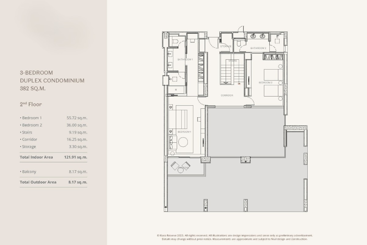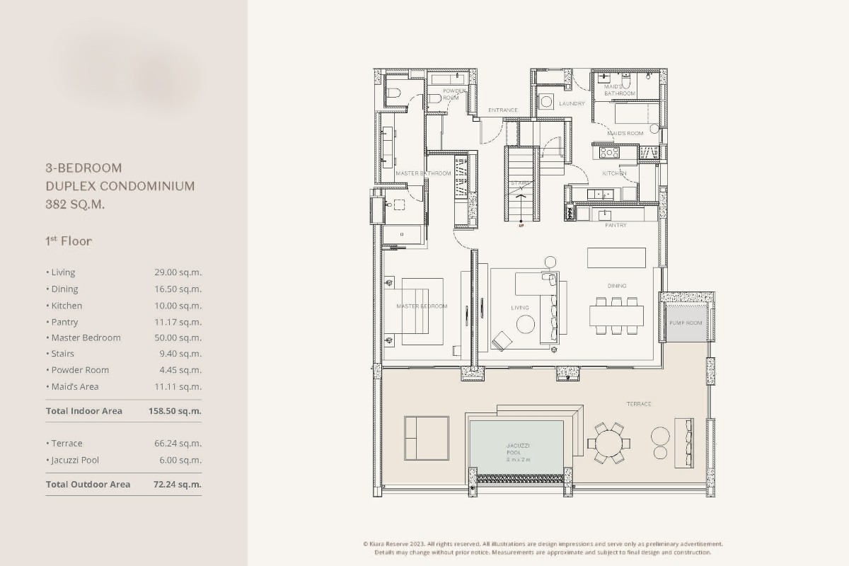 Duplex residences offer 3 bedrooms over 2 levels with a built-up area of 382 sqm. The ground floor features an open-plan living, dining, and kitchen area, a master bedroom with ensuite, a guest bathroom, and a maid’s room with ensuite. Upstairs are 2 ensuite bedrooms, a balcony, and a mezzanine overlooking the living area below.