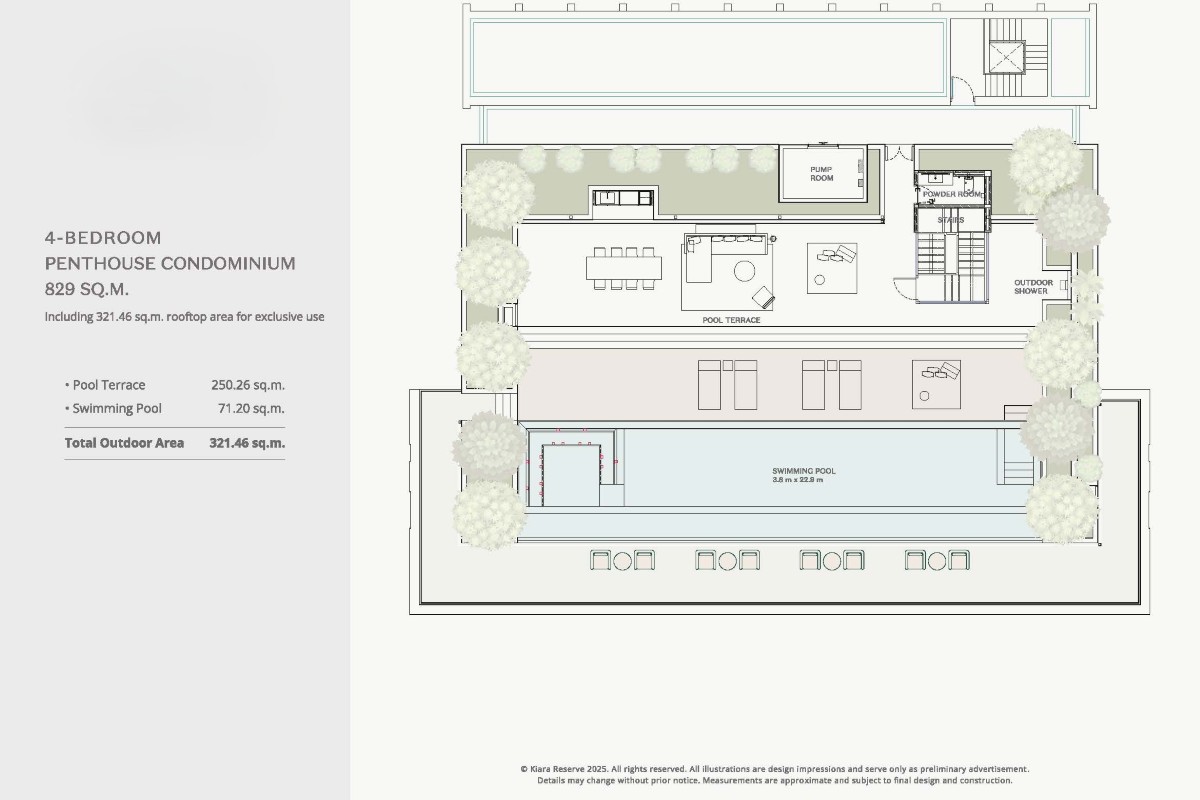 Penthouses include 85.03 sqm of outdoor space on the lower level, plus a 321.46 sqm rooftop terrace with a large 71.20 sqm private pool.