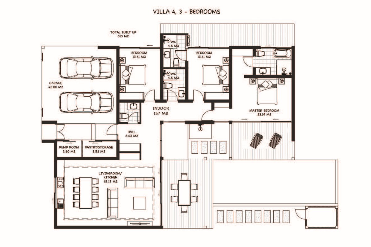 Both the 3-bedroom and 4-bedroom options offer 177 sqm of indoor living, with a total built-up area of around 336 sqm. All rooms sit under one roof with seamless indoor access. In addition, the main living area and master bedroom also open directly onto the pool terrace. A central hallway separates the open-plan living, dining, and kitchen space from the bedrooms, resulting in a private and well-zoned layout.