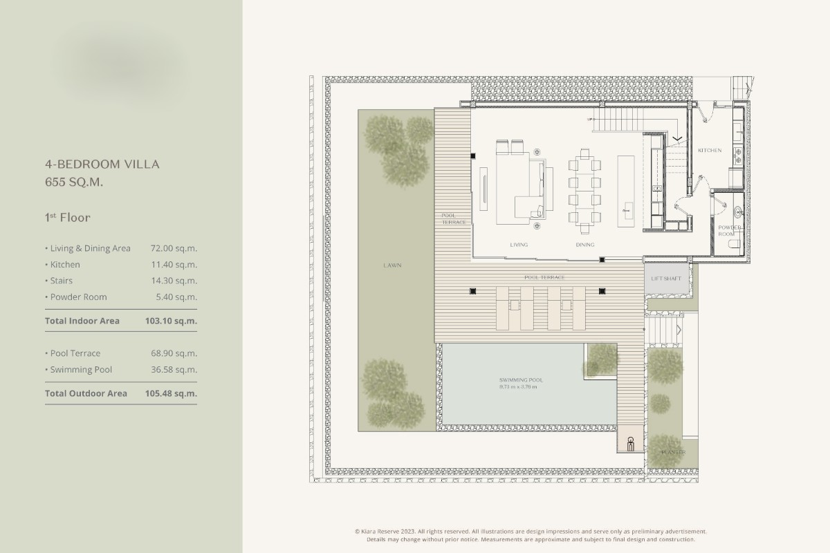4-bedroom pool villas provide a larger built-up area of 655 sqm with a similar 3-storey layout. These homes include 4 ensuite bedrooms on the upper floor, with expanded living and outdoor spaces.