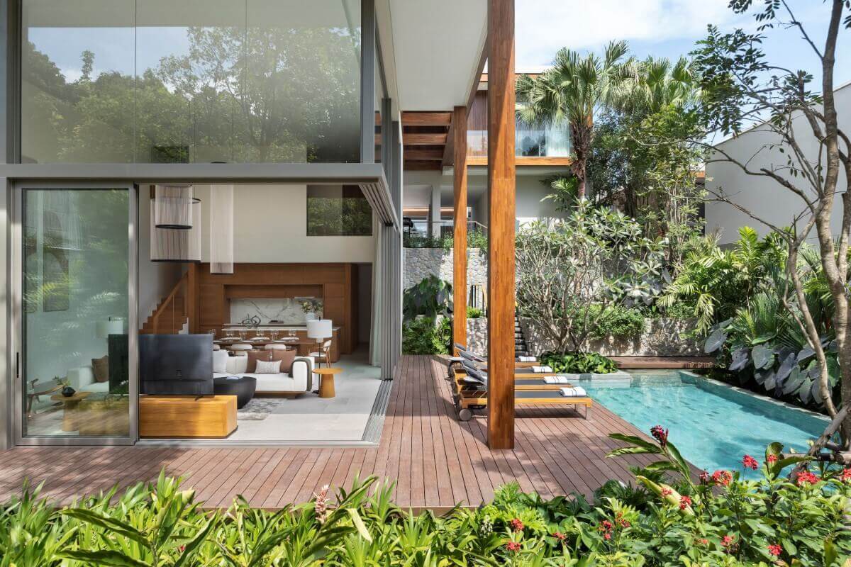 These 3–4 bedroom pool villas for sale in Layan, Phuket are set within the 5-star Layan Bay area, tucked into a lush tropical hillside. The villas feature modern tropical architecture with clean lines, floor-to-ceiling glass, and open double-height living spaces that connect seamlessly to the surrounding greenery.
