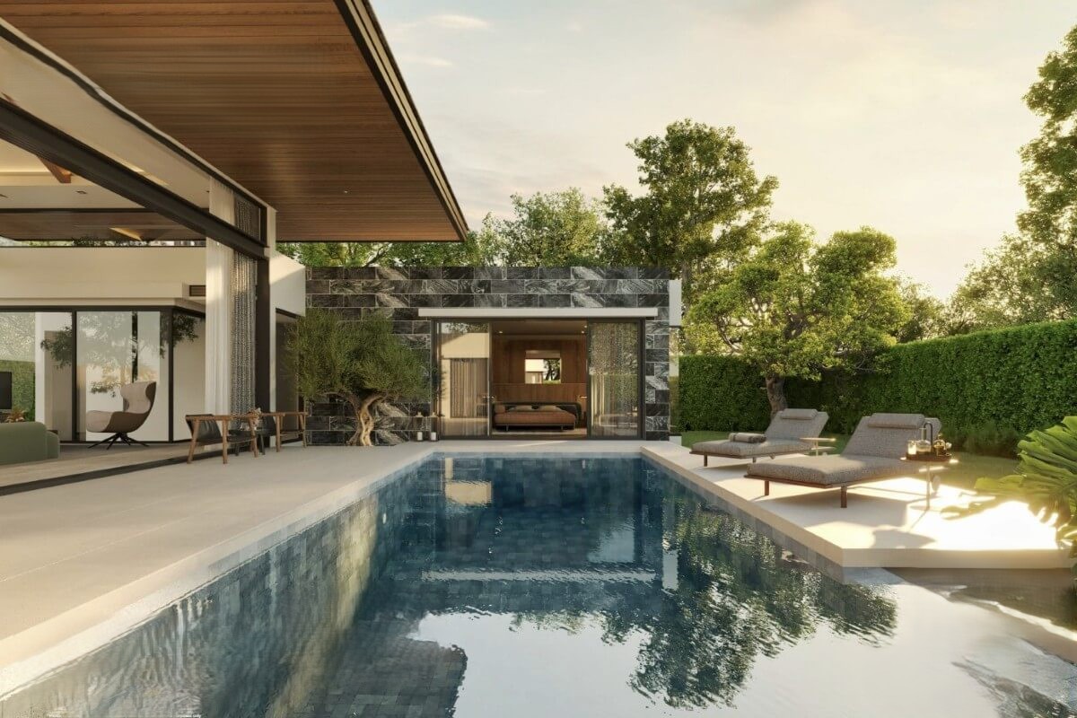 Private pools range from 31.50 sqm to an expansive 63 sqm, complemented by poolside terraces designed for loungers. Pools sit either within the U-shaped villa layout for direct access or slightly forward to allow for larger sizes and more complete sala areas.
