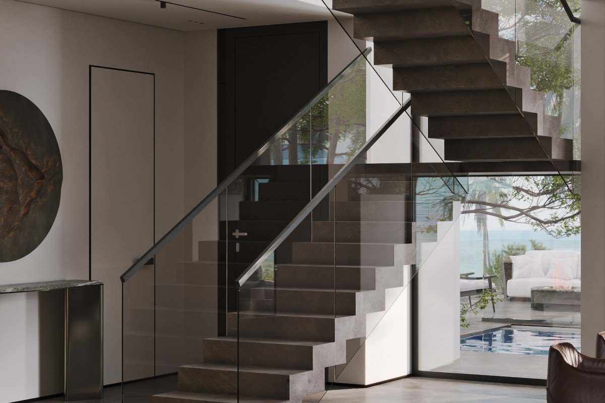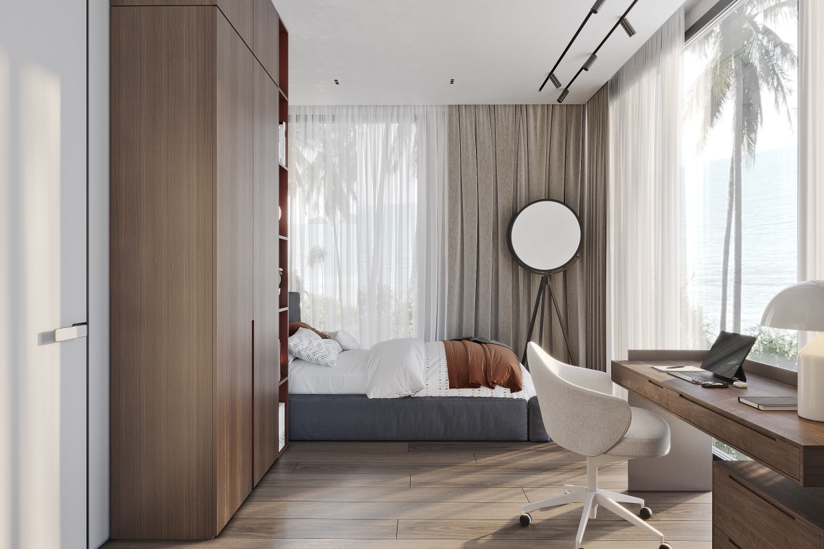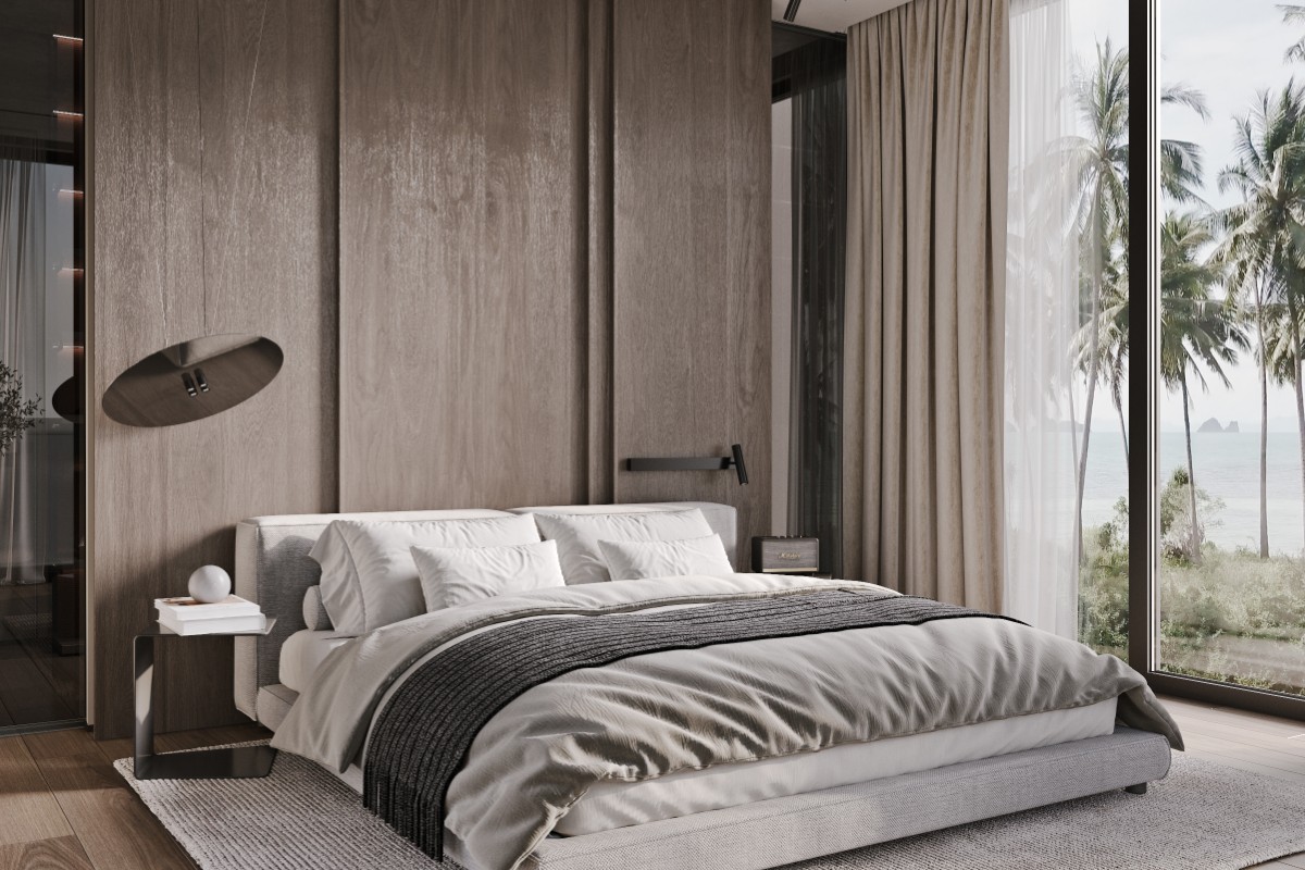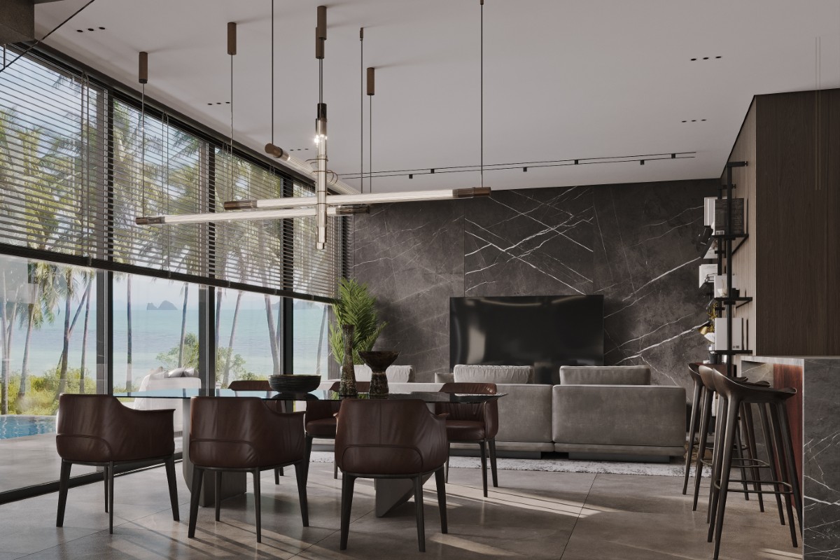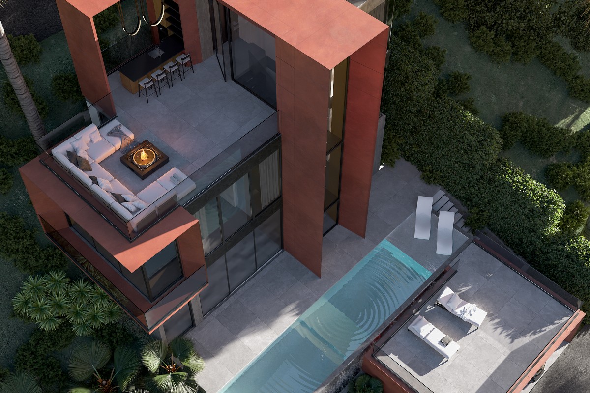 Strong geometric forms and layered volumes follow the natural contours of the hillside. Dark grey tones paired with deep red accents give the villas a bold visual identity. As a result, they stand out while remaining well integrated into the landscape. Multi-level living spaces open onto generous terraces, many oriented towards the Andaman Sea. Homeowners enjoy a relaxed coastal lifestyle, while the project also offers strong long-term investment potential.