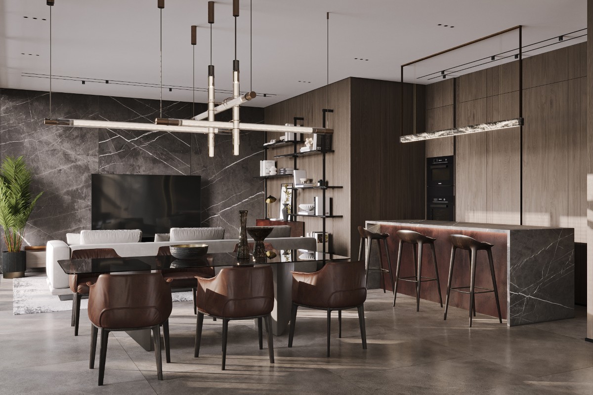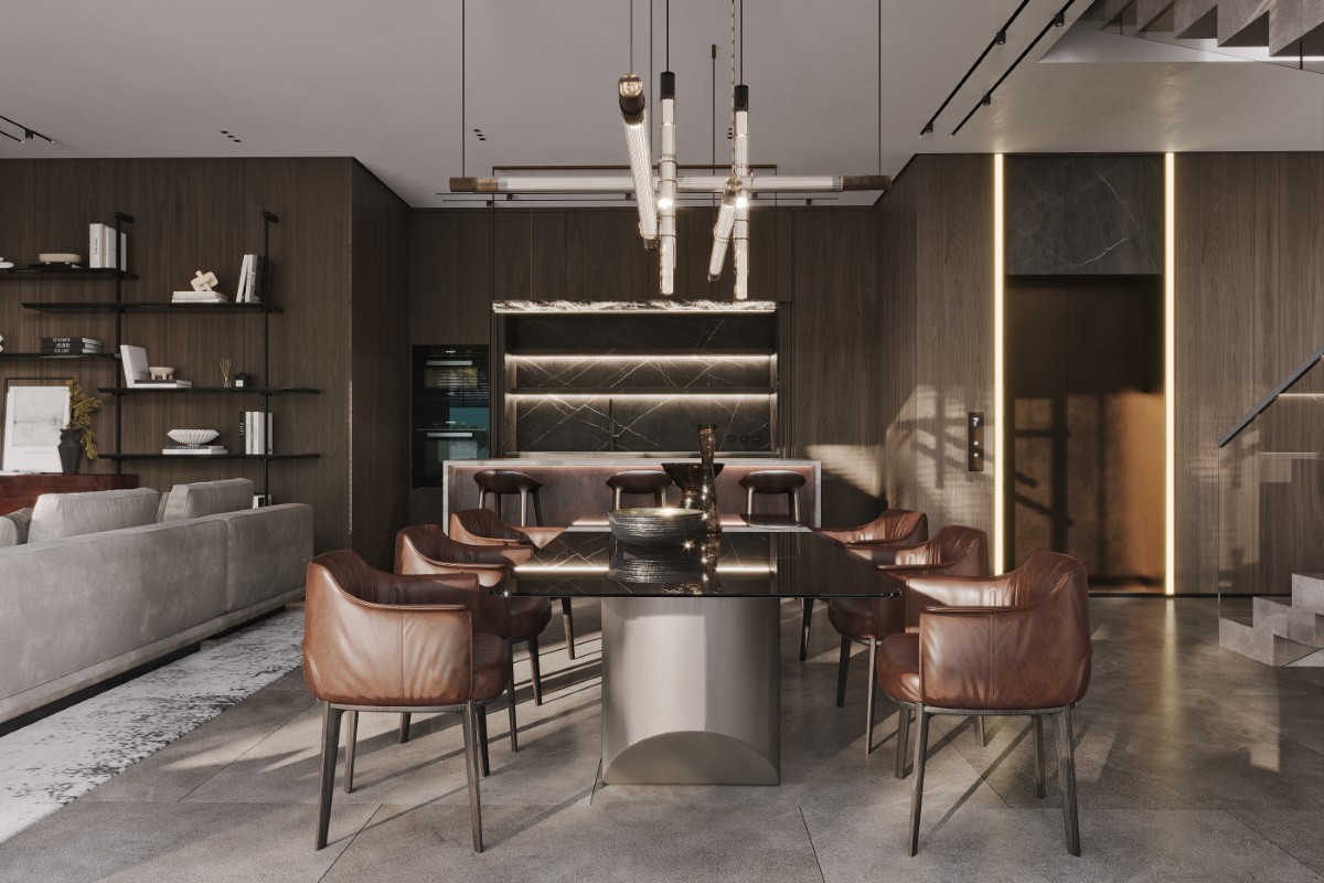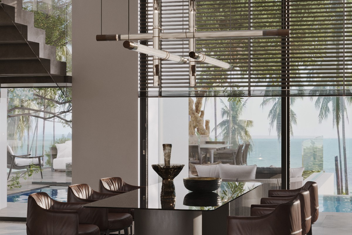 The villas are 3-level tropical residences with built-up areas ranging from 431 to 470 sqm. On the ground floor, open-plan kitchens connect directly with the dining and living areas, which then open onto the pool terraces. A guest bathroom is positioned beside the staircase.