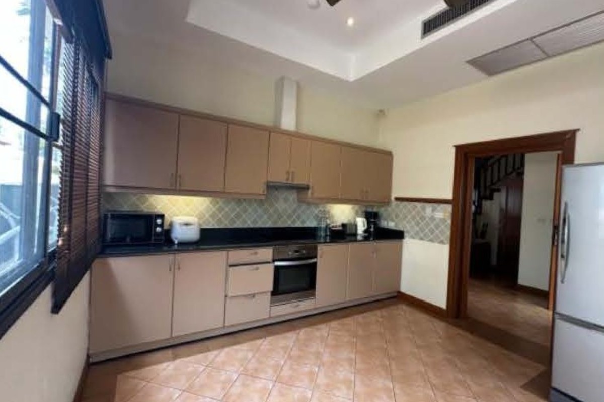 The villa offers an approximate built-up area of 400 sqm across 2 storeys. The layout is practical and easy to live in. The ground floor centres around a generous open-plan living and dining area. A fully equipped western kitchen is set separately. Floor-to-ceiling glass walls and sliding doors on two sides bring in natural light. These open directly onto the covered terrace, private swimming pool, and garden. A bedroom is also located on this level. A separate maid’s room is positioned nearby.