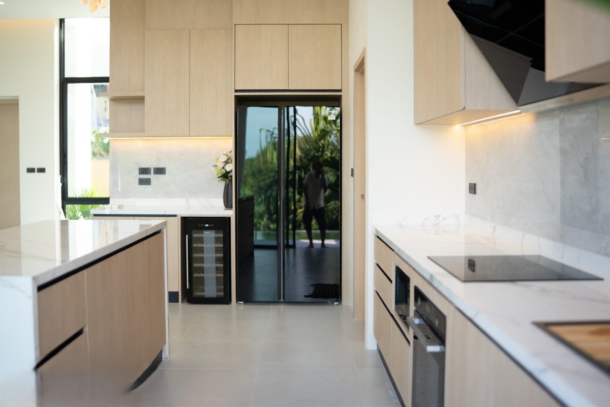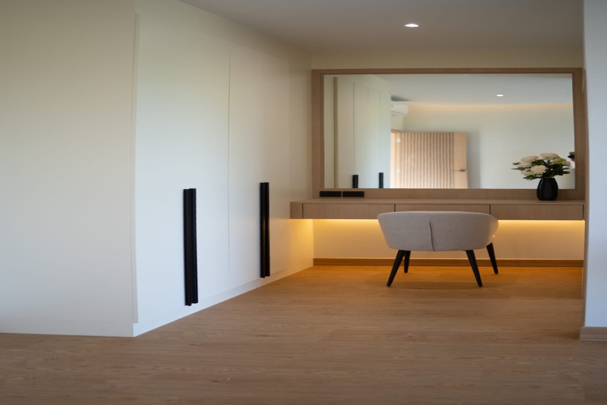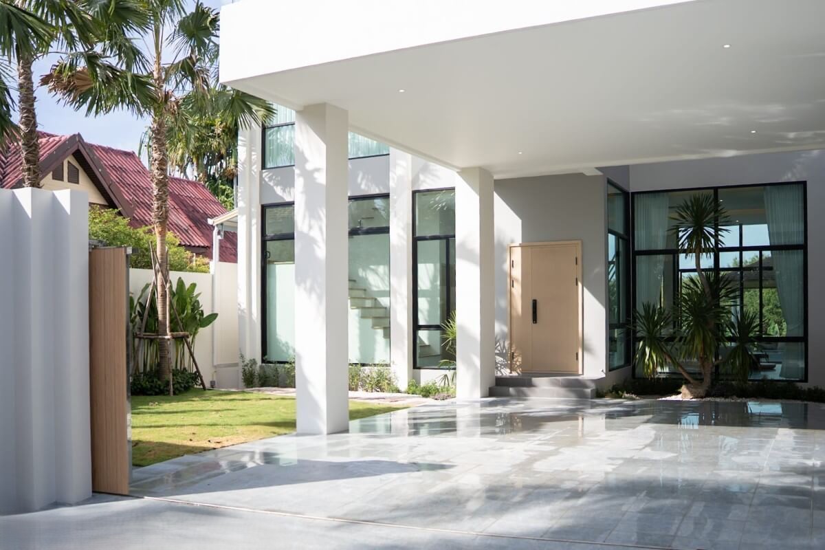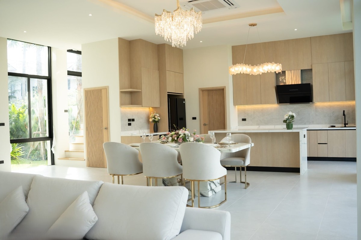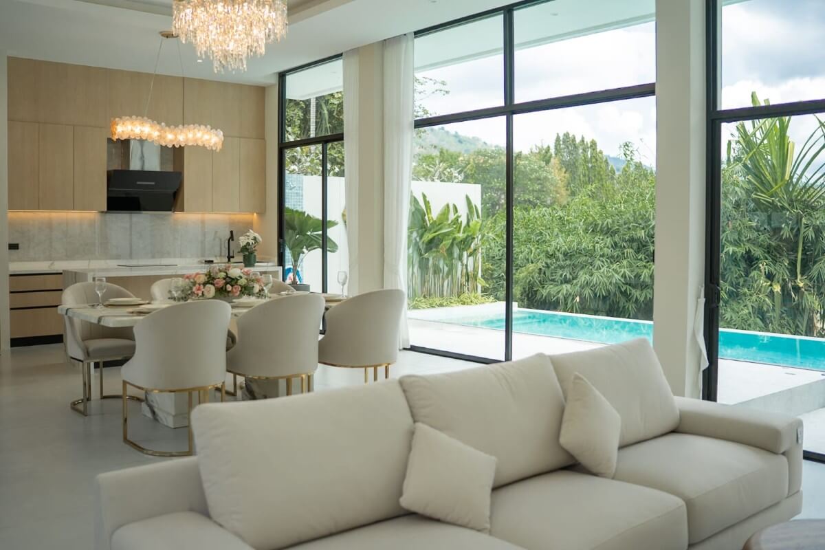 This 3-bedroom pool villa for sale in Chalong, Phuket is near Lotus’s and is offered fully furnished direct from the owner. Bright white walls contrast with dark window and door frames, while tall glass panels allow natural light to fill the interior. Inside, the palette remains neutral in beige tones, complemented by oak wood accents that add warmth and balance to the contemporary design.