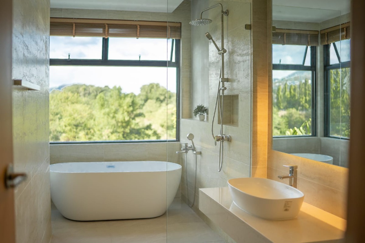 The ground floor features an open-plan living, dining, and kitchen area which open up to the pool deck. Also on this level is a guest bathroom. Upstairs, all 3 bedrooms include ensuite bathrooms, with some enjoying private balconies and views of treetops and the surrounding hills.