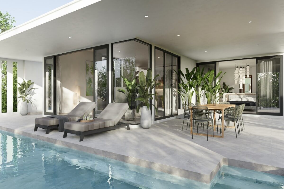 The 14 x 3.5 meter rim-flow pool with the 100 sqm undercover terrace is the centerpiece of the villa. Elevated positioning maximizes views of the lush mountain backdrop, while shaded terraces provide comfortable spaces to unwind with family and friends. Each villa sits on a generous plot of 459- 481 sqm.