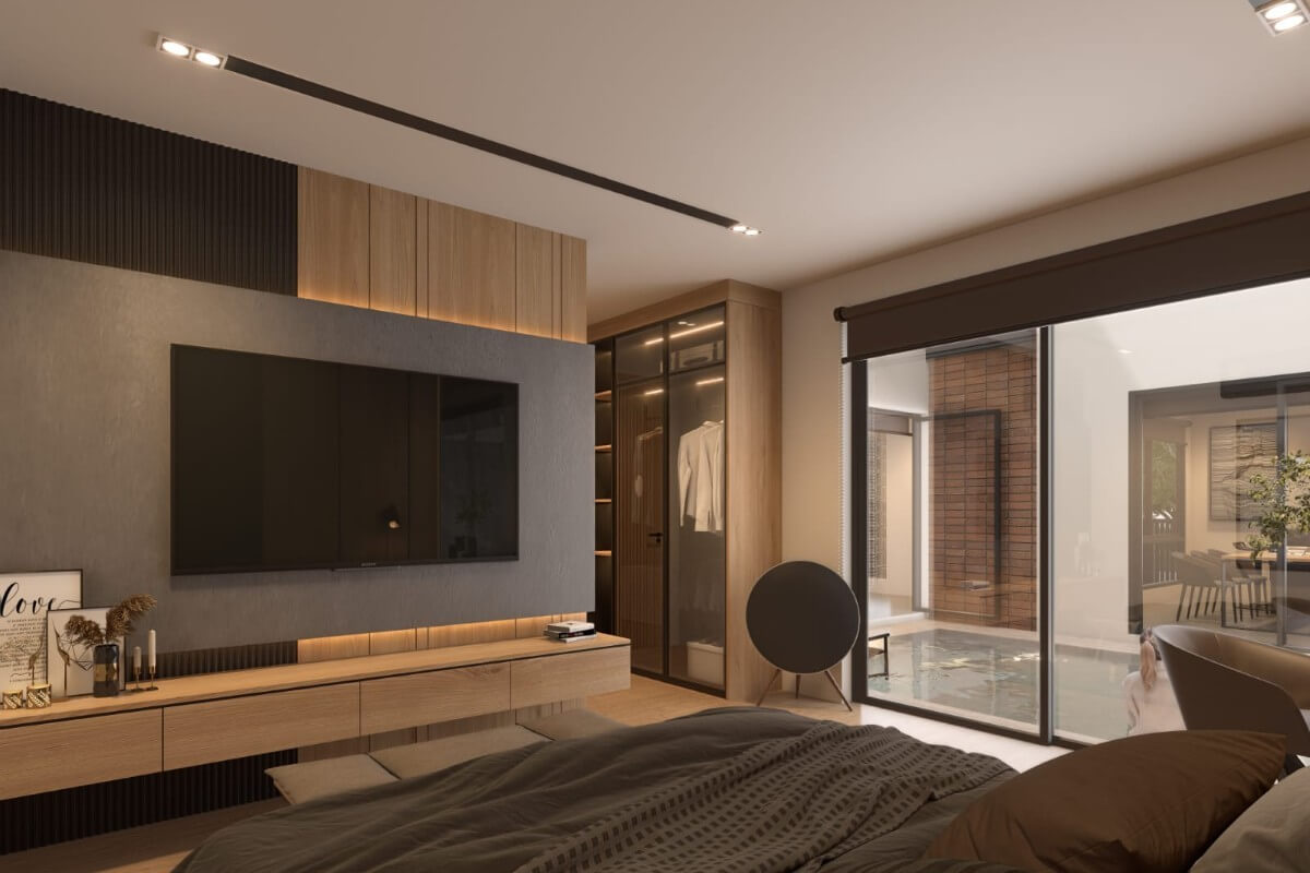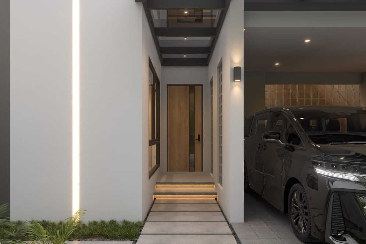 Set on a 228 sqm plot, the villa features a well-planned indoor-outdoor layout with an indoor-style private swimming pool and covered parking for 2 cars. A landscaped green edge at the end of the pool adds a touch of greenery to the otherwise clean, architectural courtyard design.
