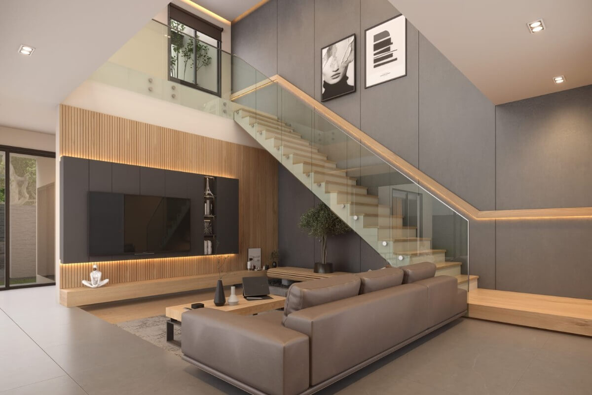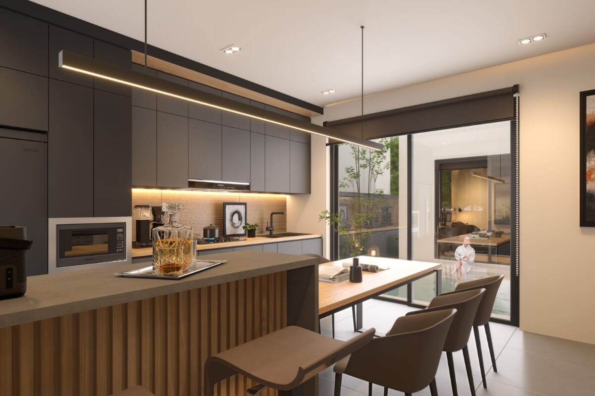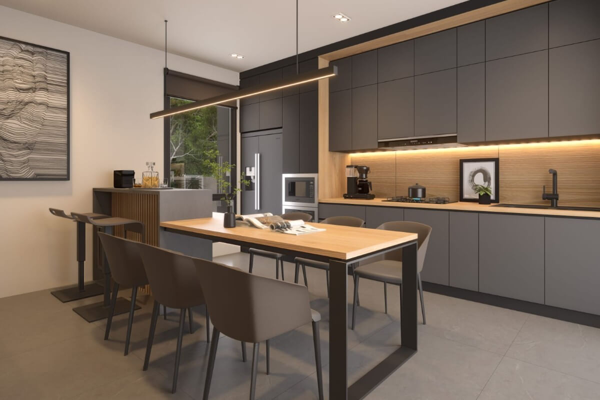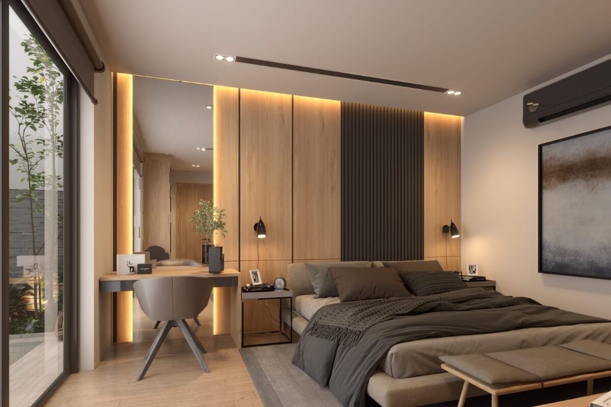 This 3-bedroom pool villa for sale in Chalong, Phuket is located near Robinson Lifestyle Mall.  The double-volume ceiling over the living area creates a sense of space and natural light, enhancing the open-plan layout. Sleek oak finishes paired with grey-toned interiors give the villa a modern yet warm feel.