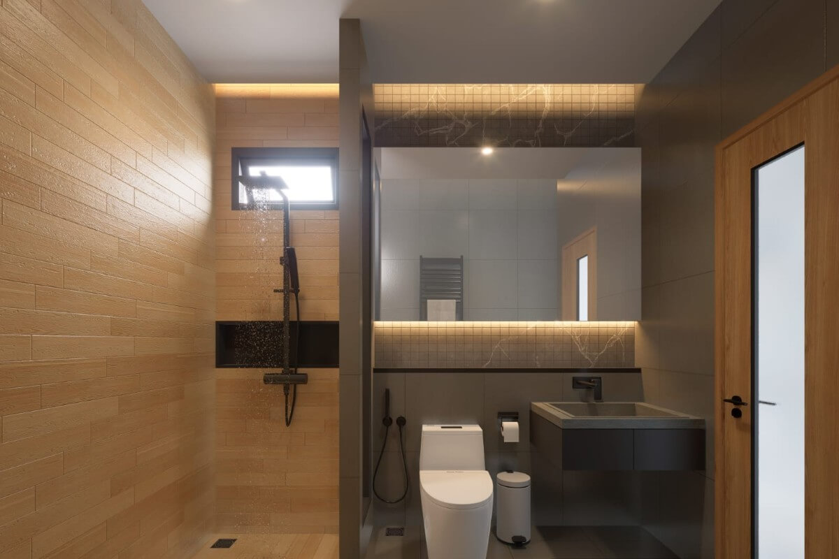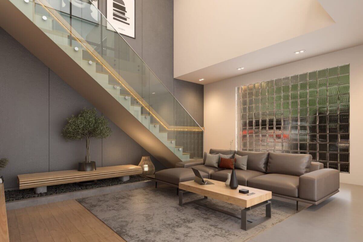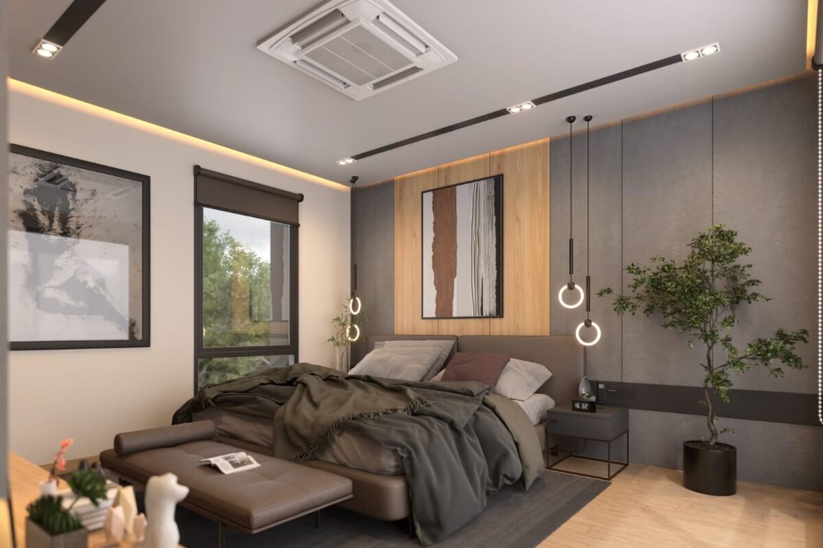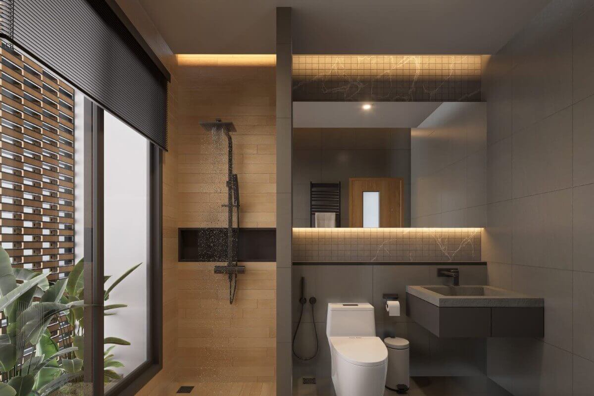 This 3-bedroom pool villa for sale in Chalong, Phuket is located near Robinson Lifestyle Mall.  The double-volume ceiling over the living area creates a sense of space and natural light, enhancing the open-plan layout. Sleek oak finishes paired with grey-toned interiors give the villa a modern yet warm feel.