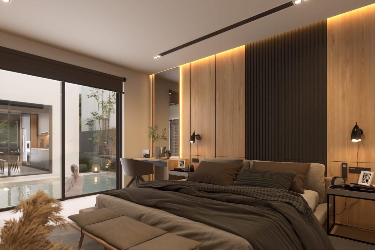 This fully furnished villa has a built-up area of 240 sqm, with the open-plan living, dining, and kitchen area located on the ground floor. Large sliding doors connect the living area and the dining area directly to the central pool, reinforcing the indoor–outdoor flow throughout the ground floor. One bedroom can be found downstairs with direct pool access, while 2 additional bedrooms are located upstairs.