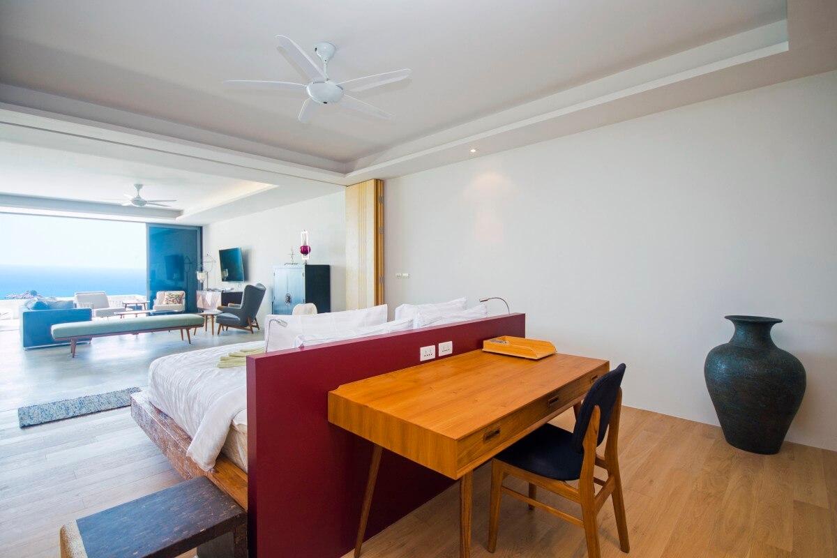 The main living space features full-width accordion-style folding glass walls that open completely from one end to the other. Two en-suite bedrooms positioned along the rear of the living area are fitted with the same wall system. When opened, the space becomes entirely wall-free, allowing uninterrupted sea views, while the elevated setting ensures complete privacy. Behind the 2nd bedroom is a 3rd ensuite bedroom, along with a separate laundry area positioned further back.