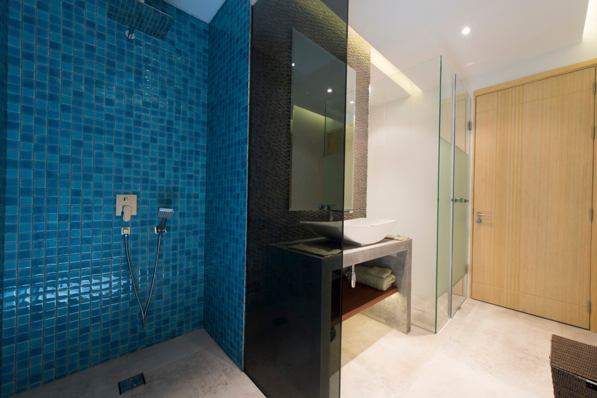 The outdoor living area is 60 sqm and includes a 12-metre infinity swimming pool with an integrated jacuzzi and waterfall feature, and an outdoor shower. The hillside setting allows for open sea views overlooking Layan, creating a private setting designed for relaxed outdoor living.
