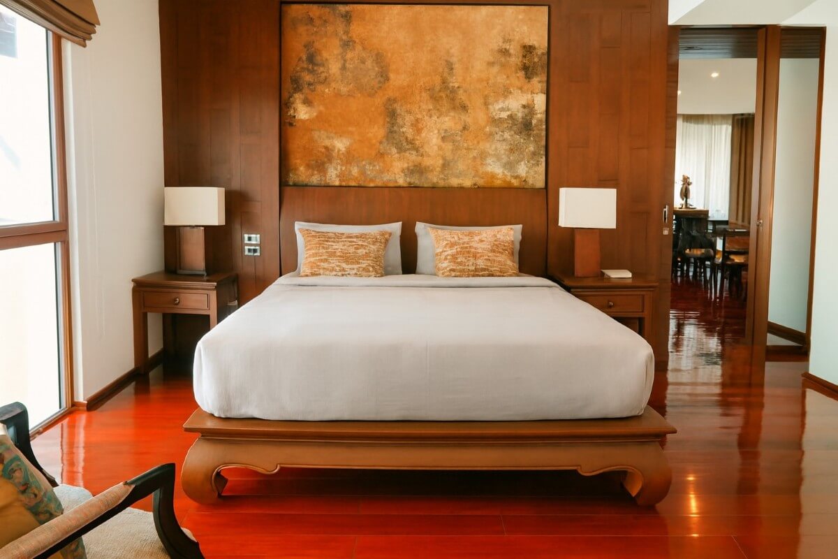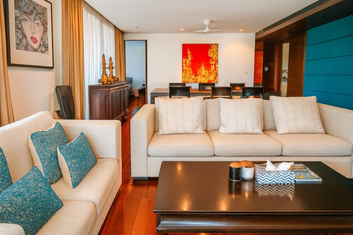 This 3-bedroom sea view condo for sale in Koh Kaew, Phuket is one of only a few penthouse units in the marina development. The interior features mahogany-colored wooden flooring, plush white sofas, and dark wood dining and living furniture. Teak furniture is used in the bedrooms, while Thai-style sculptures, wall art, and cushions add character to the space.