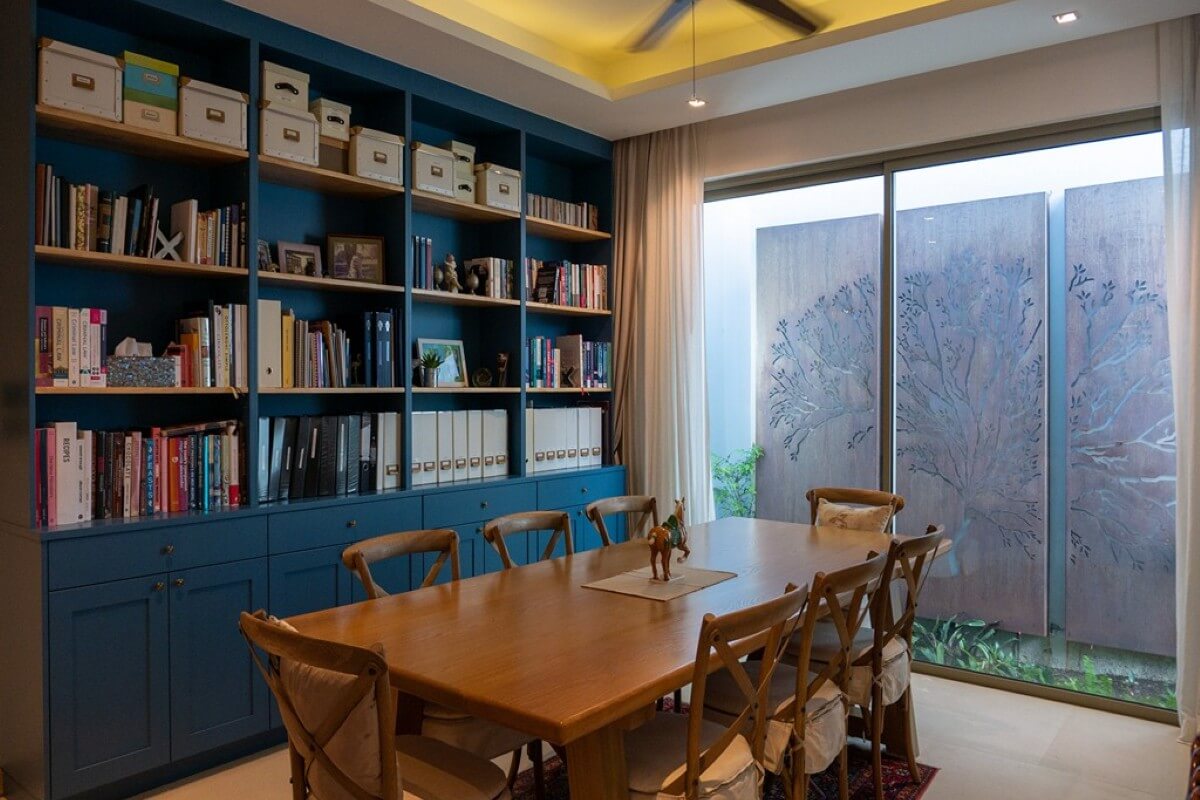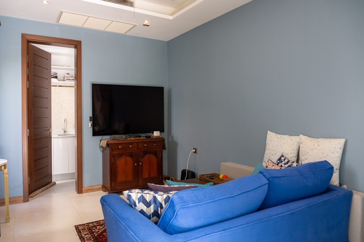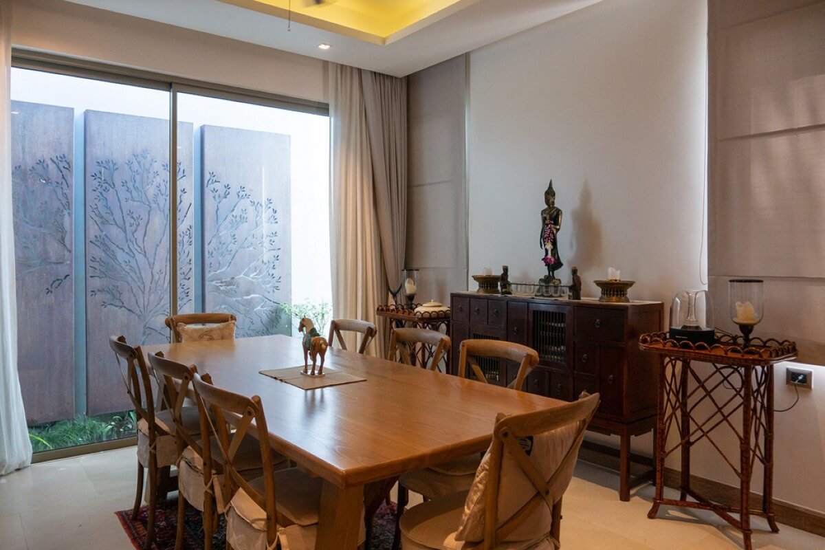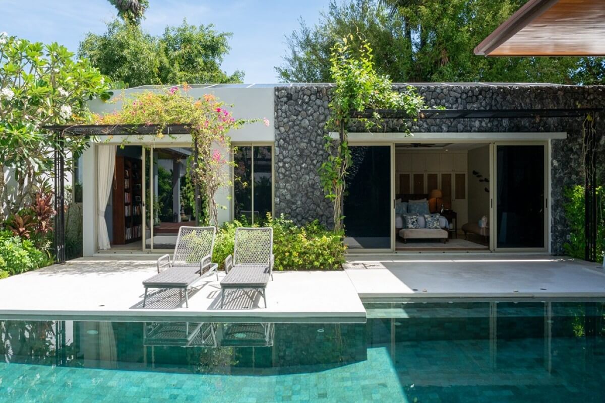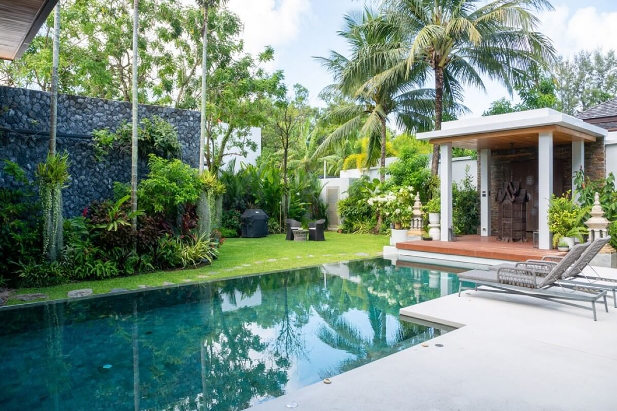 The villa is set on a large 824 sqm plot, with a spacious covered terrace extending from the living area and connecting directly to the 12-metre pool and sun deck. A shaded sala, mature gardens, and ambient night lighting complete this tranquil outdoor setting.