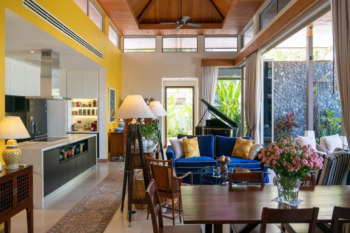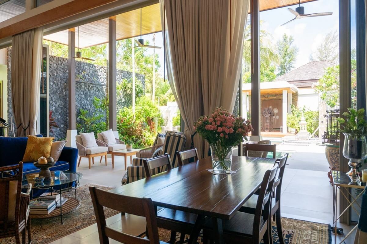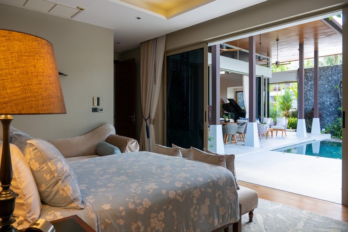 This 4-5 bedroom pool villa for sale near Bang Tao Beach, Phuket features a large 60 sqm private swimming pool. Vaulted ceilings enhance the sense of space. Ducted air-conditioning, ceiling fans, and full-height bi-folding Sun Paradise tinted glass doors create seamless indoor–outdoor flow.