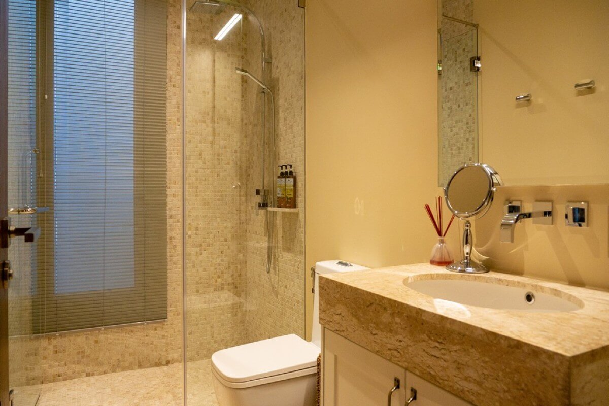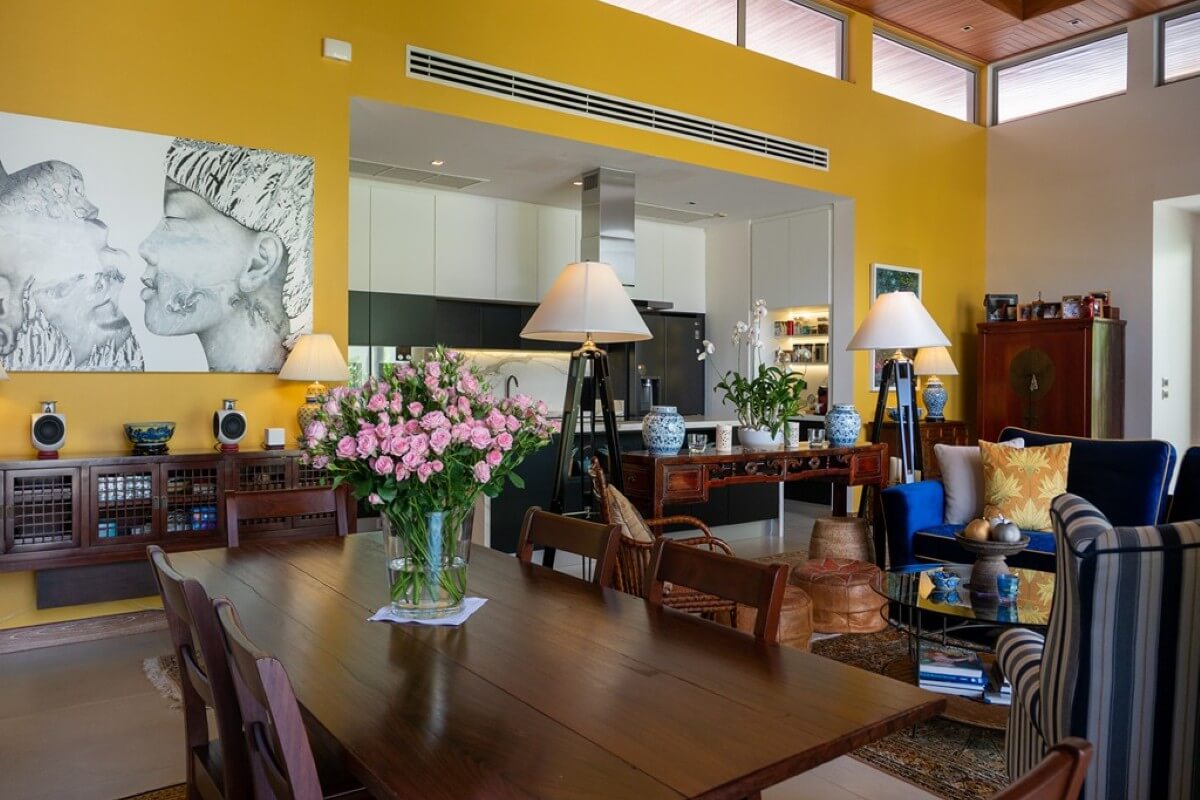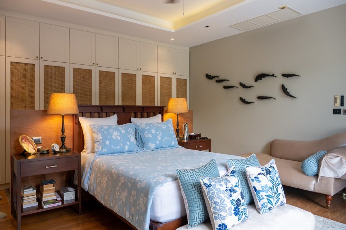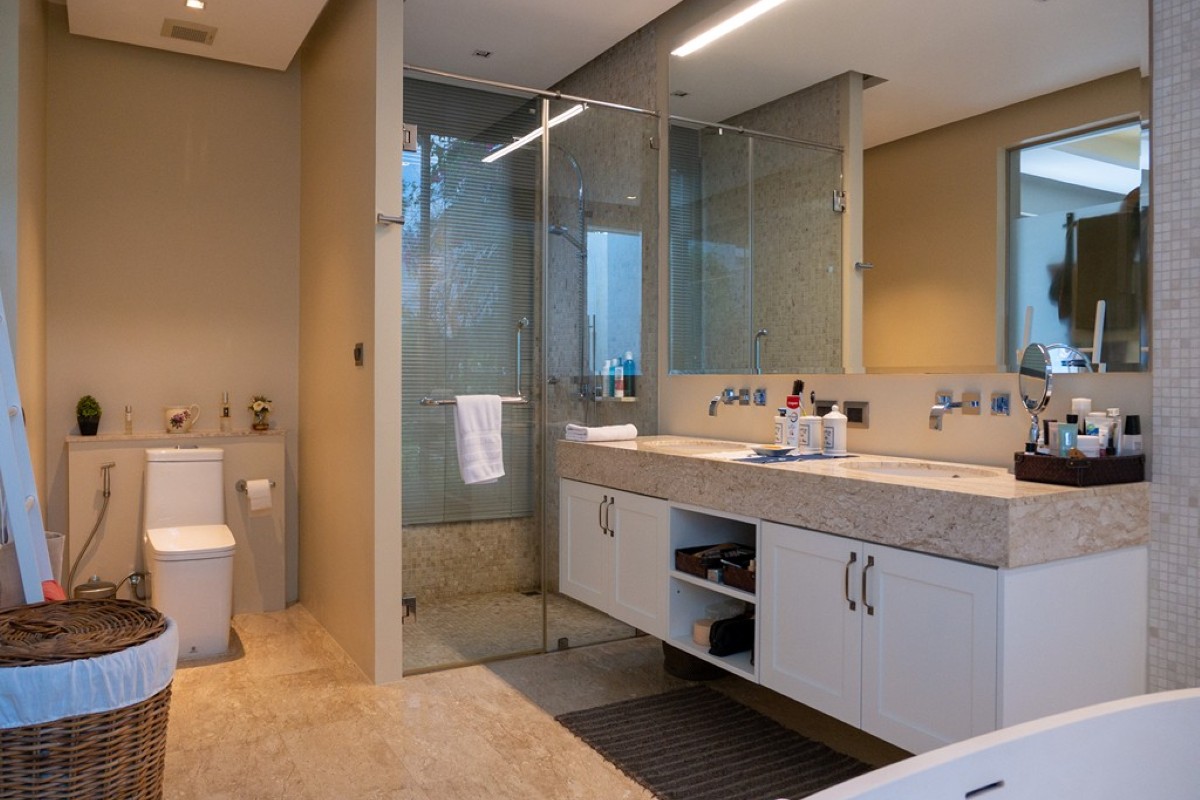 This 4-5 bedroom pool villa for sale near Bang Tao Beach, Phuket features a large 60 sqm private swimming pool. Vaulted ceilings enhance the sense of space. Ducted air-conditioning, ceiling fans, and full-height bi-folding Sun Paradise tinted glass doors create seamless indoor–outdoor flow.