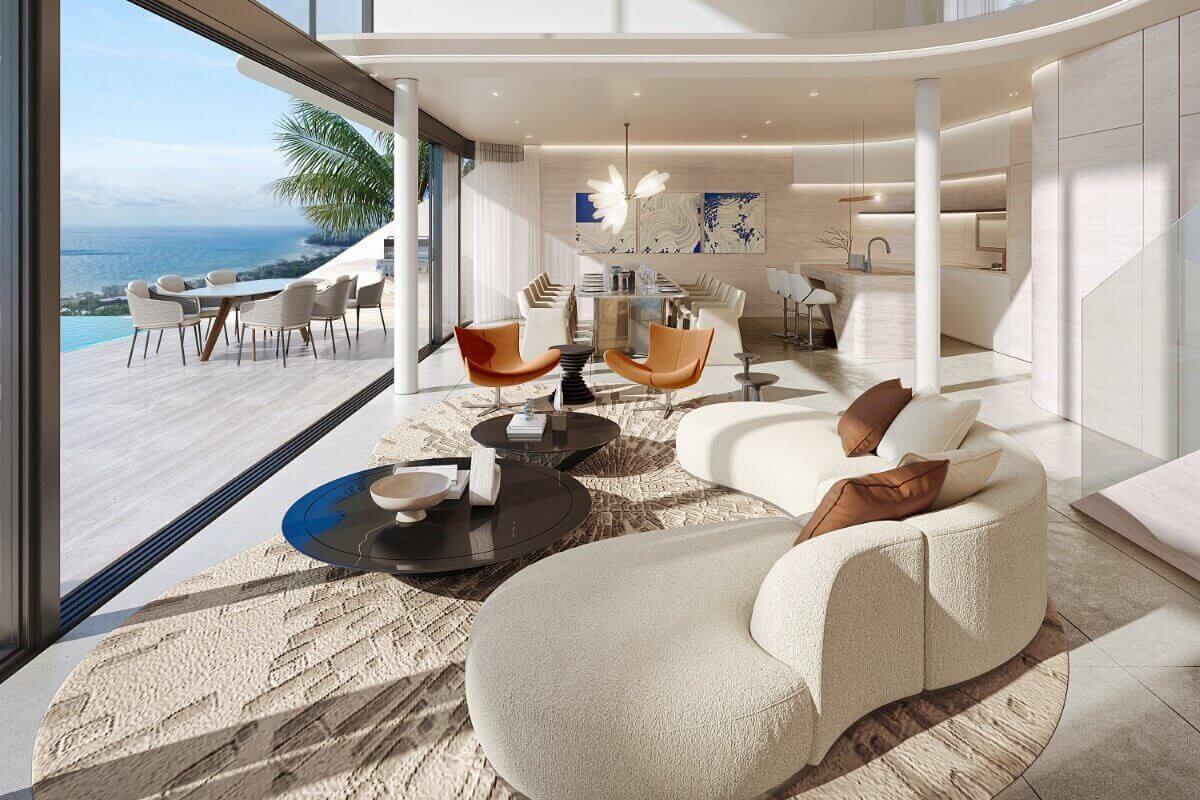 The middle level holds the main living and entertainment areas, opening to the infinity pool. Designed for relaxation and connection, these spaces flow easily between indoors and out through full-height glass walls that invite natural light and sea breezes.