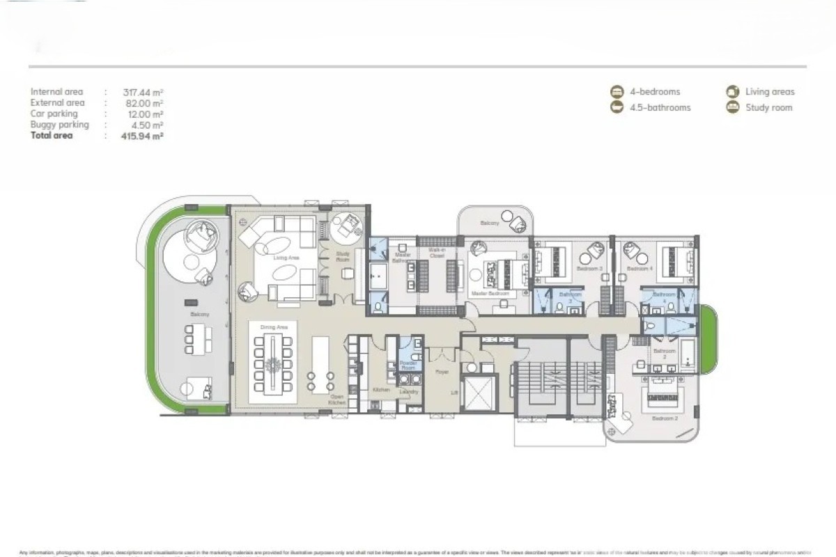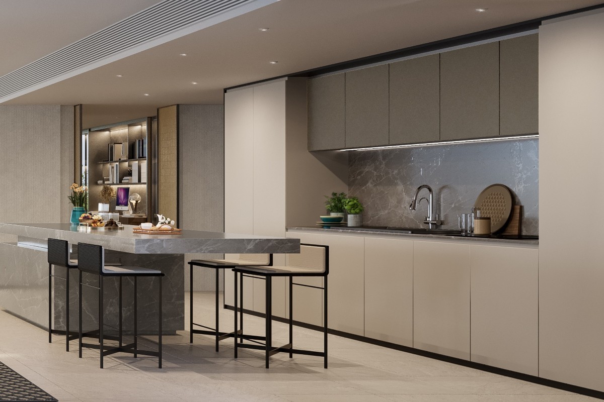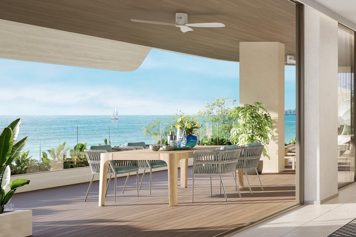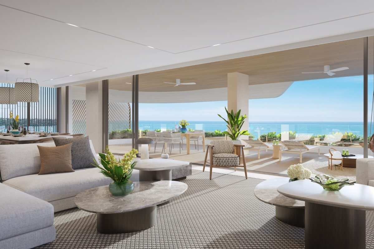 All residences enjoy wide ocean views that extend as far as the eye can see, with large front balconies designed to maximise the outlook. These spaces lead into open-plan living and dining areas with a study, a guest bathroom, and a breakfast island. A separate enclosed kitchen sits just behind this space. Toward the rear are 4 ensuite bedrooms, providing privacy and a well-planned layout for family living.