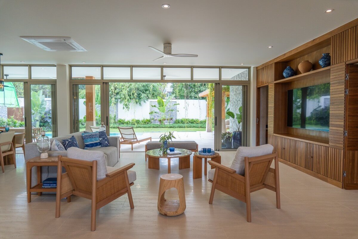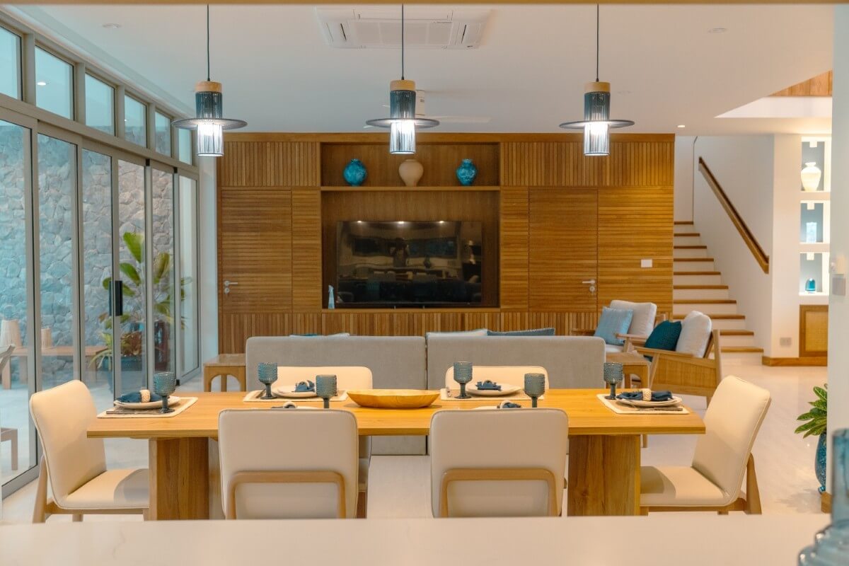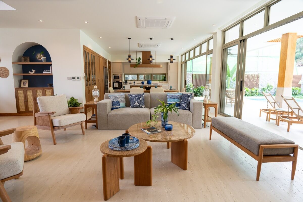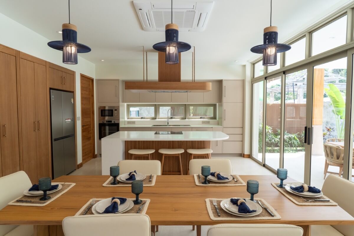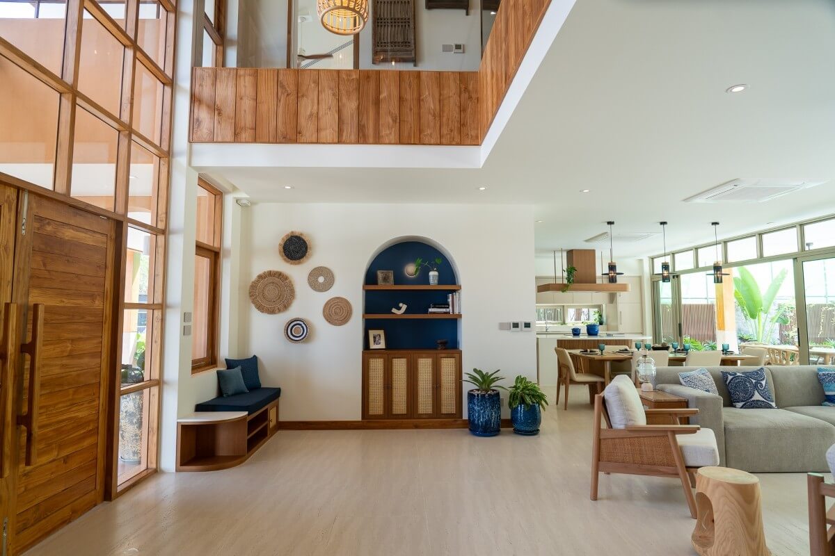 These 4-bedroom pool villas for sale in Thalang, Phuket are located in Baan Manik near Manik Dam and are designed with families and pets in mind. The architecture combines natural wood textures and comforting materials with subtle South American and Portuguese influences. Blue-and-white accents and Sino-Portuguese design elements, inspired by Phuket’s heritage, create a home that feels both welcoming and distinctly island-inspired.