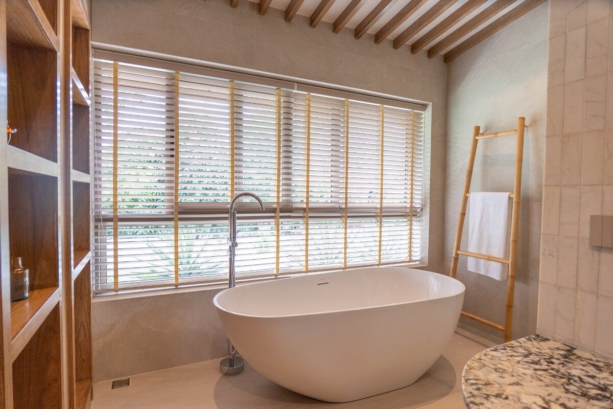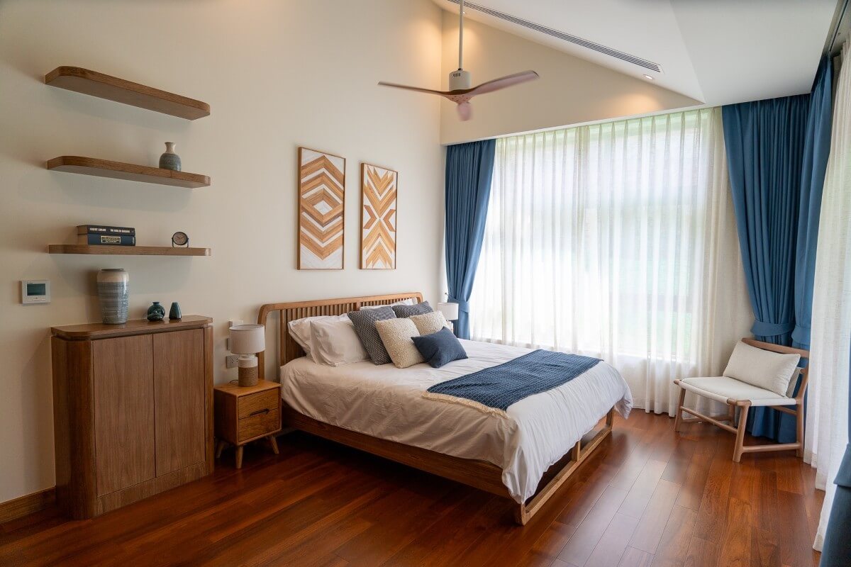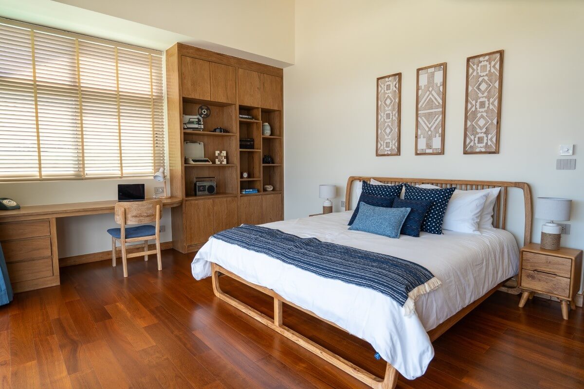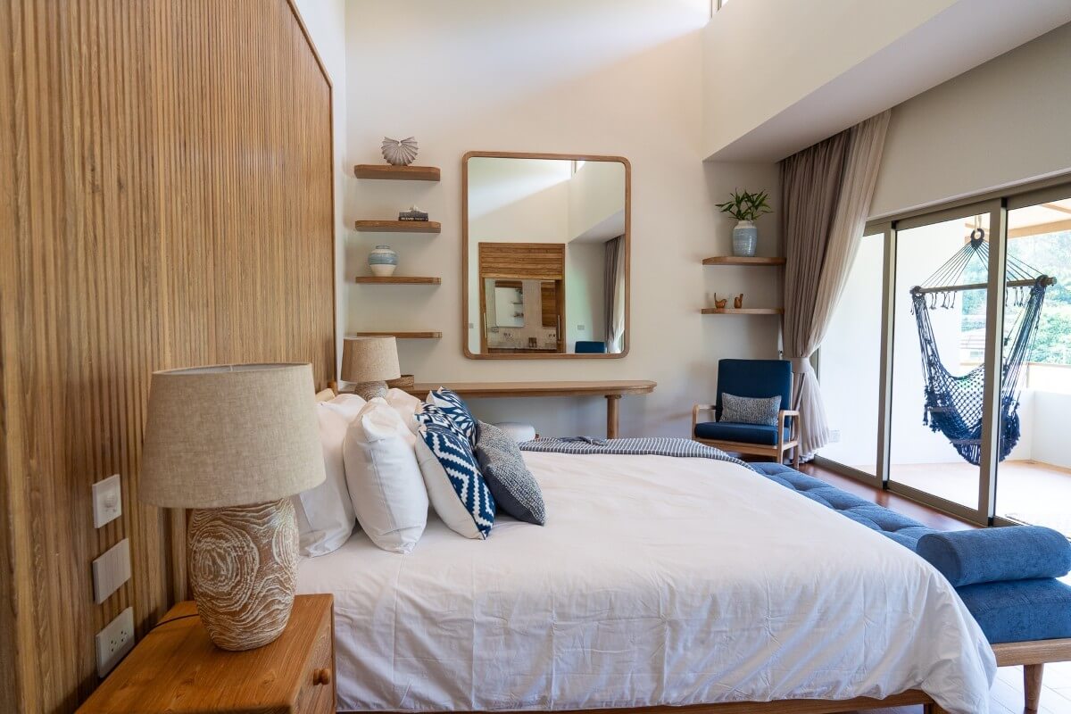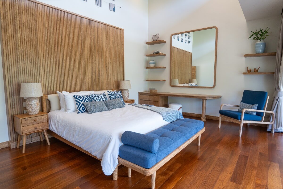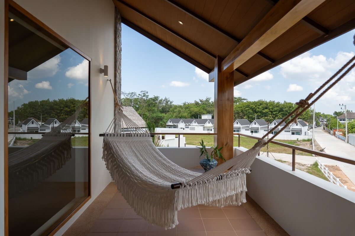 These 4-bedroom pool villas for sale in Thalang, Phuket are located in Baan Manik near Manik Dam and are designed with families and pets in mind. The architecture combines natural wood textures and comforting materials with subtle South American and Portuguese influences. Blue-and-white accents and Sino-Portuguese design elements, inspired by Phuket’s heritage, create a home that feels both welcoming and distinctly island-inspired.