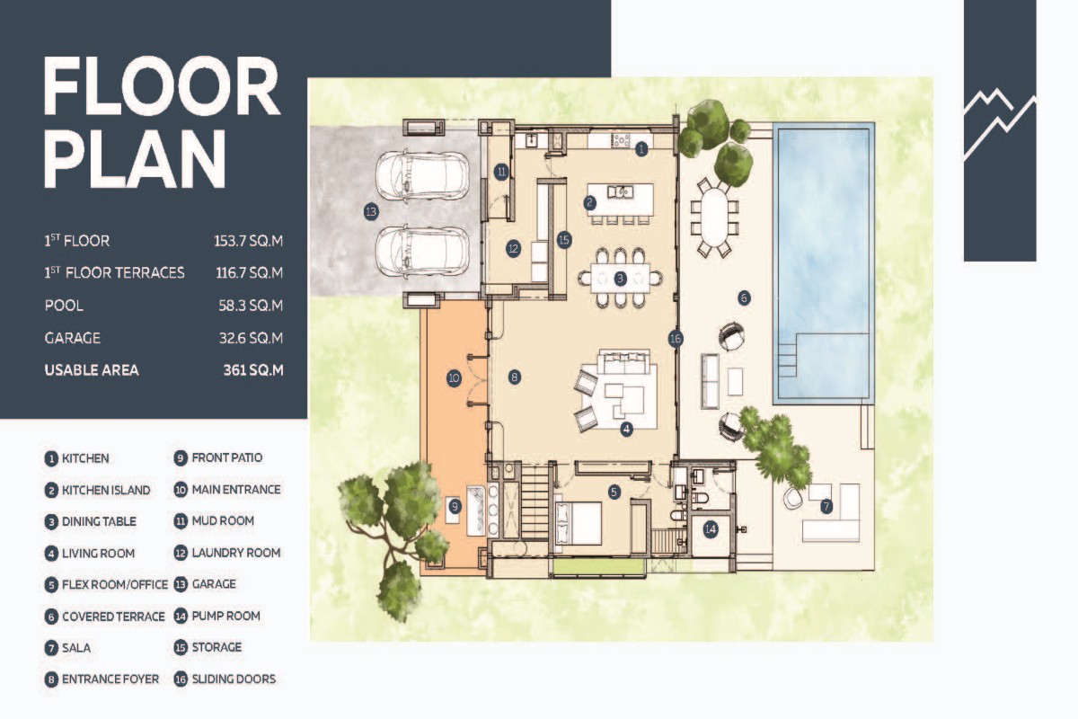 Each villa spans 2 levels with a built-up area of 599 sqm and 315 sqm of indoor space. The ground floor features high ceilings and large windows and an open-plan living, dining and kitchen area, a laundry room and a mudroom. Sliding doors open to the covered terrace and swimming pool. One bedroom is located on the ground floor, ideal for guests or grandparents.
