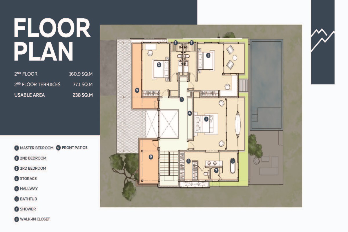Plot sizes range from 616 – 1,070 sqm, offering generous front and rear garden areas, a large covered terrace, and a sala designed for everyday family use. Each villa includes 2 parking spaces and a large 46 sqm private swimming pool. A separate guest bathroom is conveniently positioned near the pool — a rare and practical feature for outdoor entertaining.