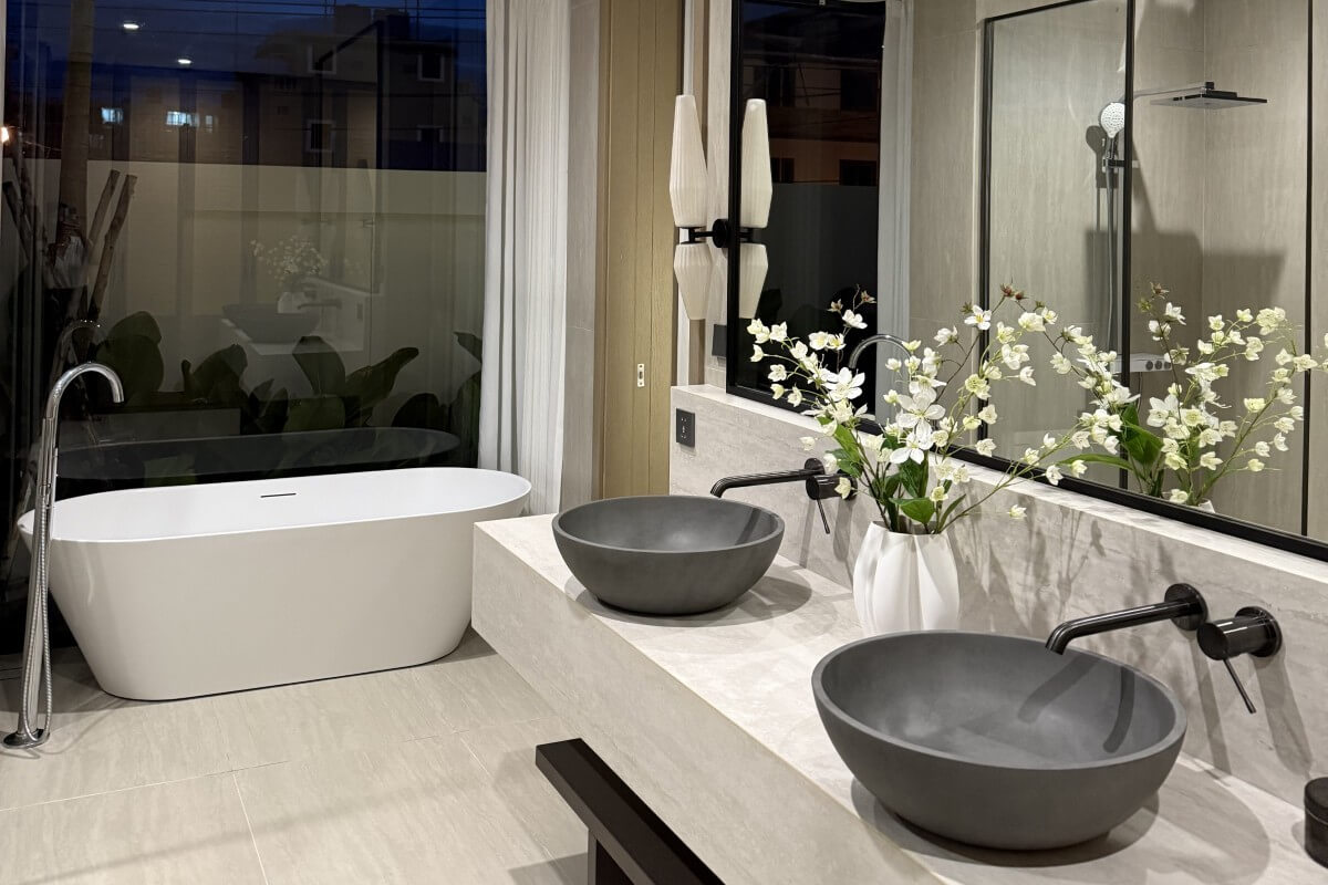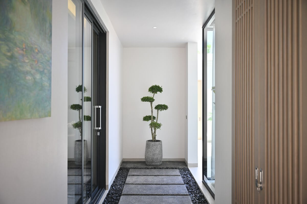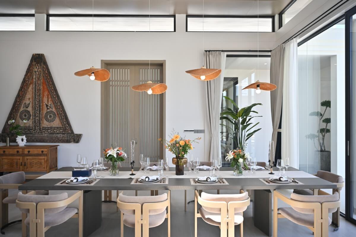 The open layout feels calm and expansive, while interiors pair soft wood finishes, natural textures, and warm neutral tones. Asian-inspired furniture and art pieces complete the look, evoking an understated coastal elegance.