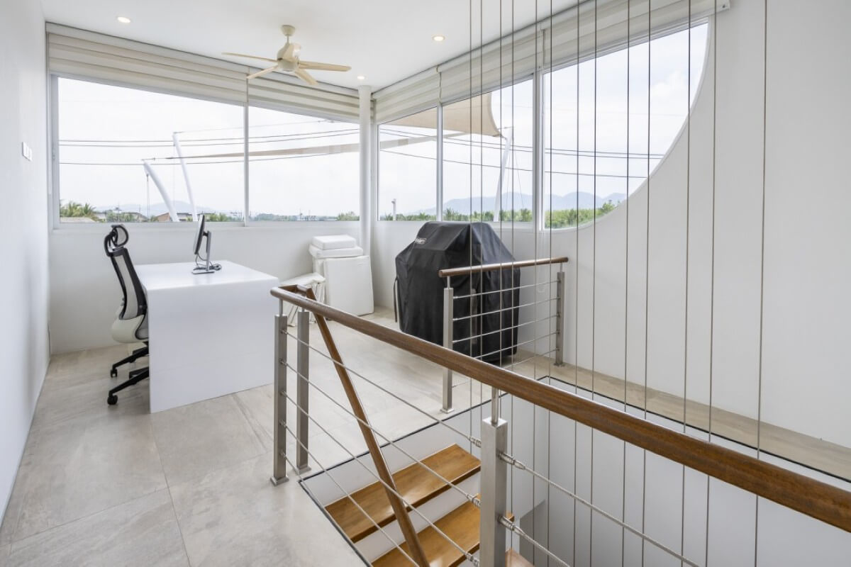 The spacious roof terrace with lounging and dining furniture adds another layer of outdoor living. Just before stepping out to this space is a landing, big enough to be used as a small office. It works perfectly as a home office, study, or reading corner, adding another layer of flexibility to the property.