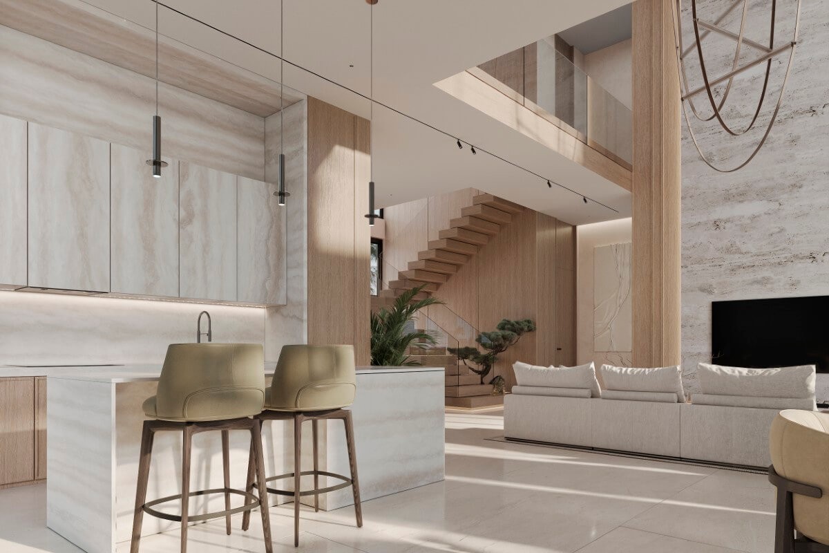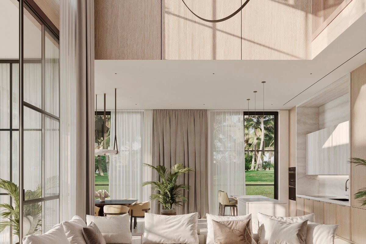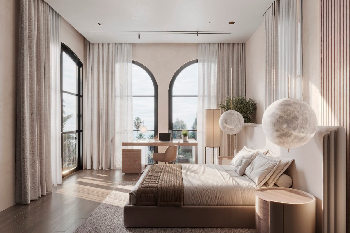 These 4-bedroom villas for sale in Chalong, Phuket are set only a 450-metre walk via local roads to Ruamrudee International School. The architecture is warm and timeless, with sand-toned façades, arched floor-to-ceiling windows, and interiors designed to welcome natural light. The layout encourages excellent cross-ventilation, creating bright, airy living spaces suited to Phuket’s tropical climate. Prices begin from the base villa package. Buyers may include a private swimming pool as an optional addition, with pricing calculated separately on a per sqm basis.
