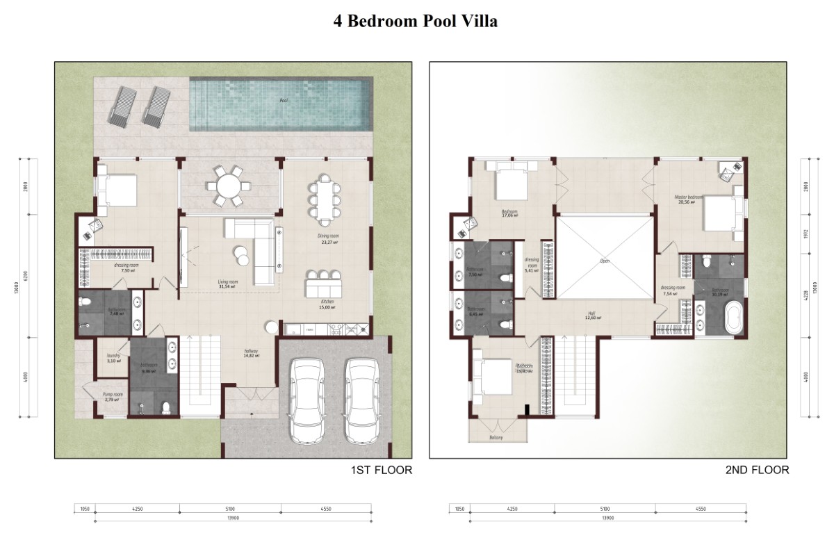 The larger design offers a built-up area of 378 sqm. The ground floor includes a spacious living room with double-height ceiling, an open dining and kitchen area, plus a bedroom with ensuite bathroom and pool access. Upstairs, 3 further bedrooms each include ensuite bathrooms, with hallways overlooking the living space below.